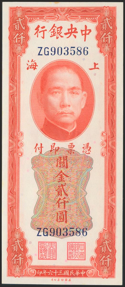 CHINA (REPUBLIC). 2000 Customs Gold Units. 1947. Central Bank of China. Orange. Printer: ABNC. Black serial number. (Pick: 340). Small stain on top margin. Uncirculated.