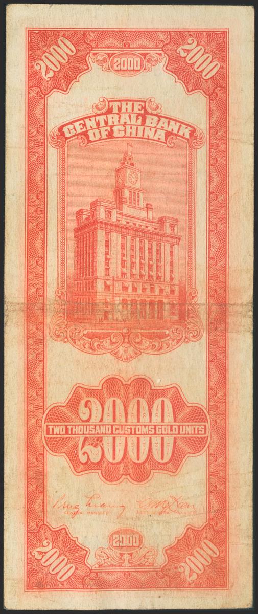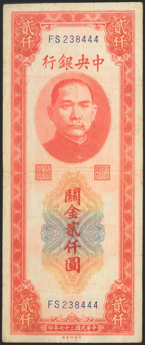 CHINA (REPUBLIC). 2000 Customs Gold Units. 1948. Central Bank of China. Orange. Printer: Chinese (5 characters). (Pick: 357). About Very Fine.