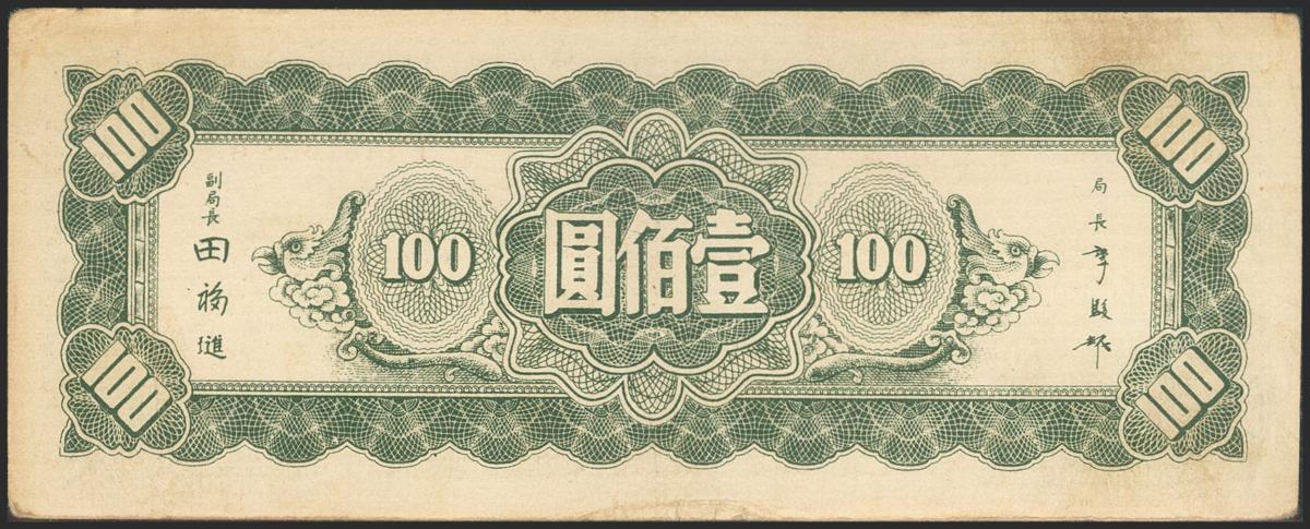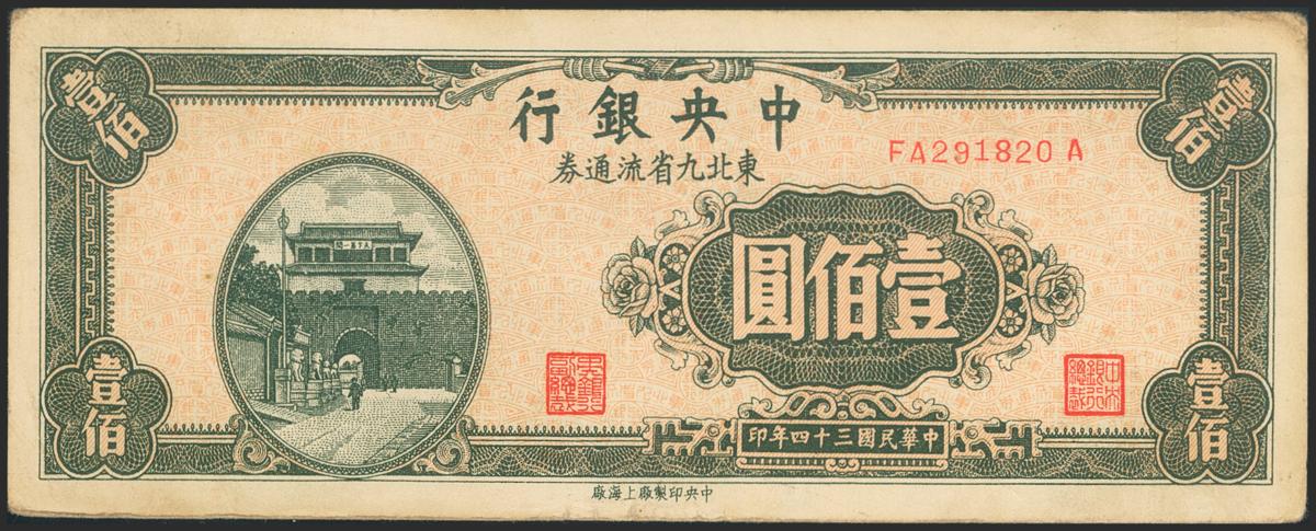 CHINA (REPUBLIC). 100 Yuan. 1945. 9 Northeastern Provinces. (Pick: 379). Small tears on lower edge. About Very Fine.