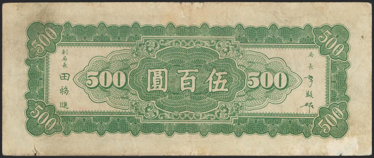 CHINA (REPUBLIC). 500 Yuan. 1946. 9 Northeastern Provinces. Shanghai printer. (Pick: 380a). Dirty, tears and delaminated paper on lower left on the back. Fine.