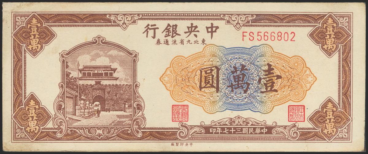 CHINA (REPUBLIC). 10000 Yuan. 1948. 9 Northeastern Provinces. (Pick: 386). Dirty and soft corners. Extremely Fine.