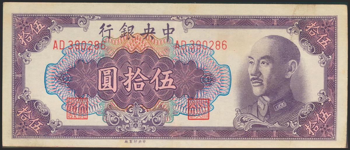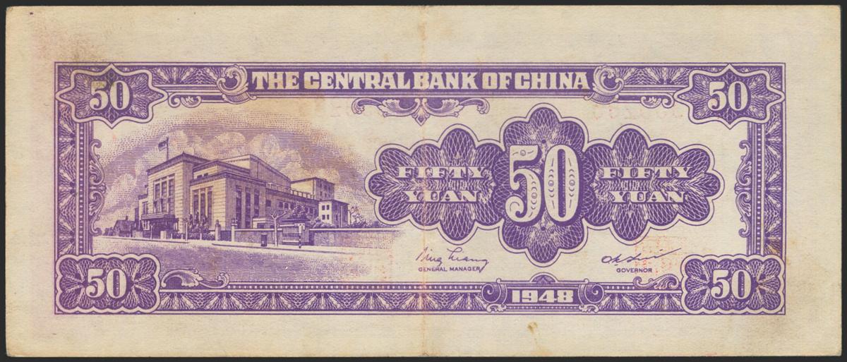 CHINA (REPUBLIC). 50 Yuan. 1948. Central Bank of China. (Pick: 403). A bit dirty on margins and pressed. About Extremely Fine.