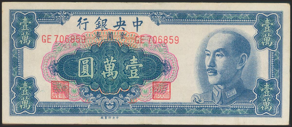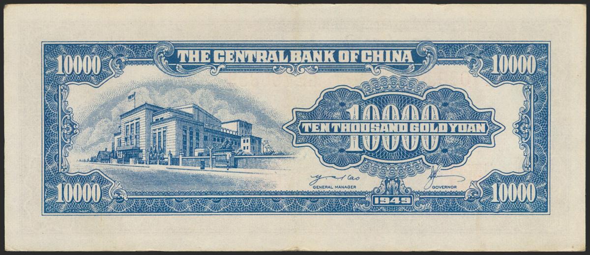 CHINA (REPUBLIC). 10.000 Gold Yuan. 1949. Central Bank of China. (Pick: 417a). Slight signs of mishandling at edges and corners. About Extremely Fine.