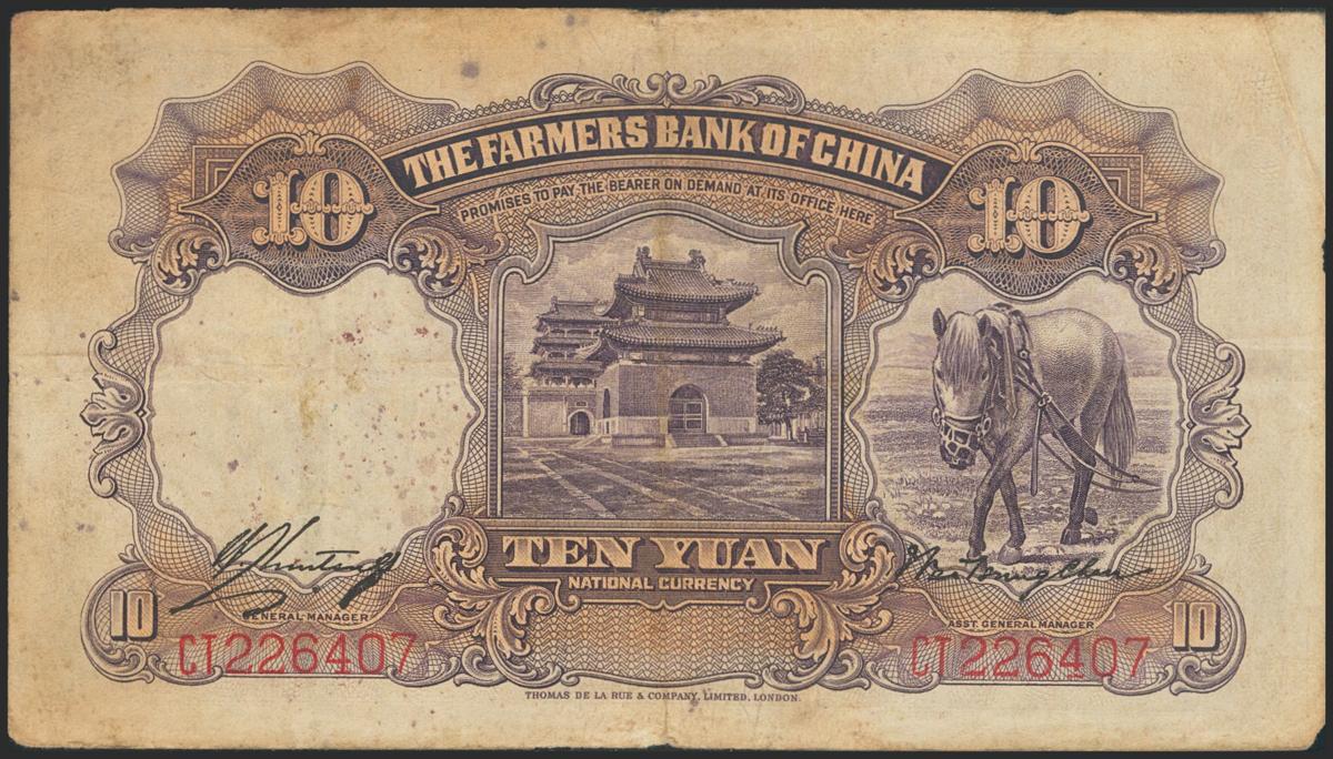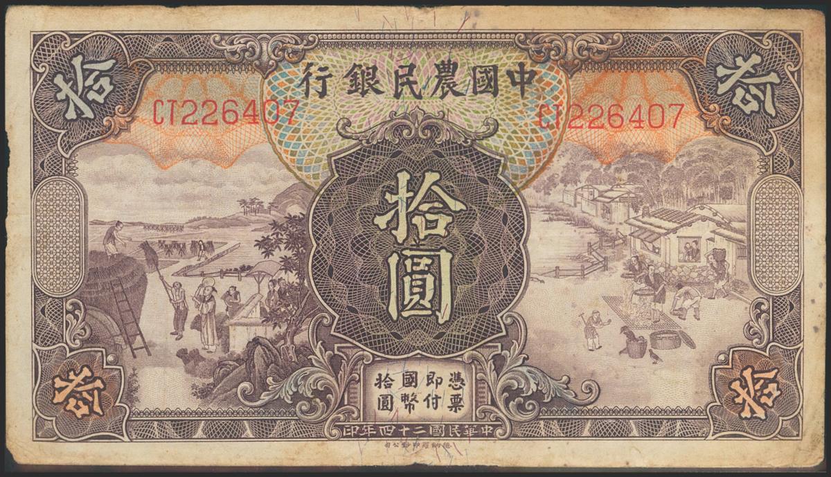 CHINA (REPUBLIC). 10 Yuan. 1935. Farmers Bank of China. (Pick: 459a). Few dents, broken or round corners, dirty. Fine.
