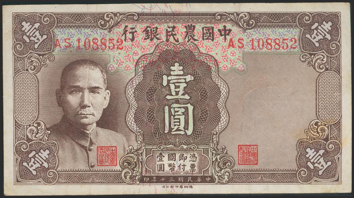 CHINA (REPUBLIC). 1 Yuan. 1941. Farmers Bank of China. Serial numbers variant with large serifed characters. (Pick: 474). Stain on the back. Very Fine.