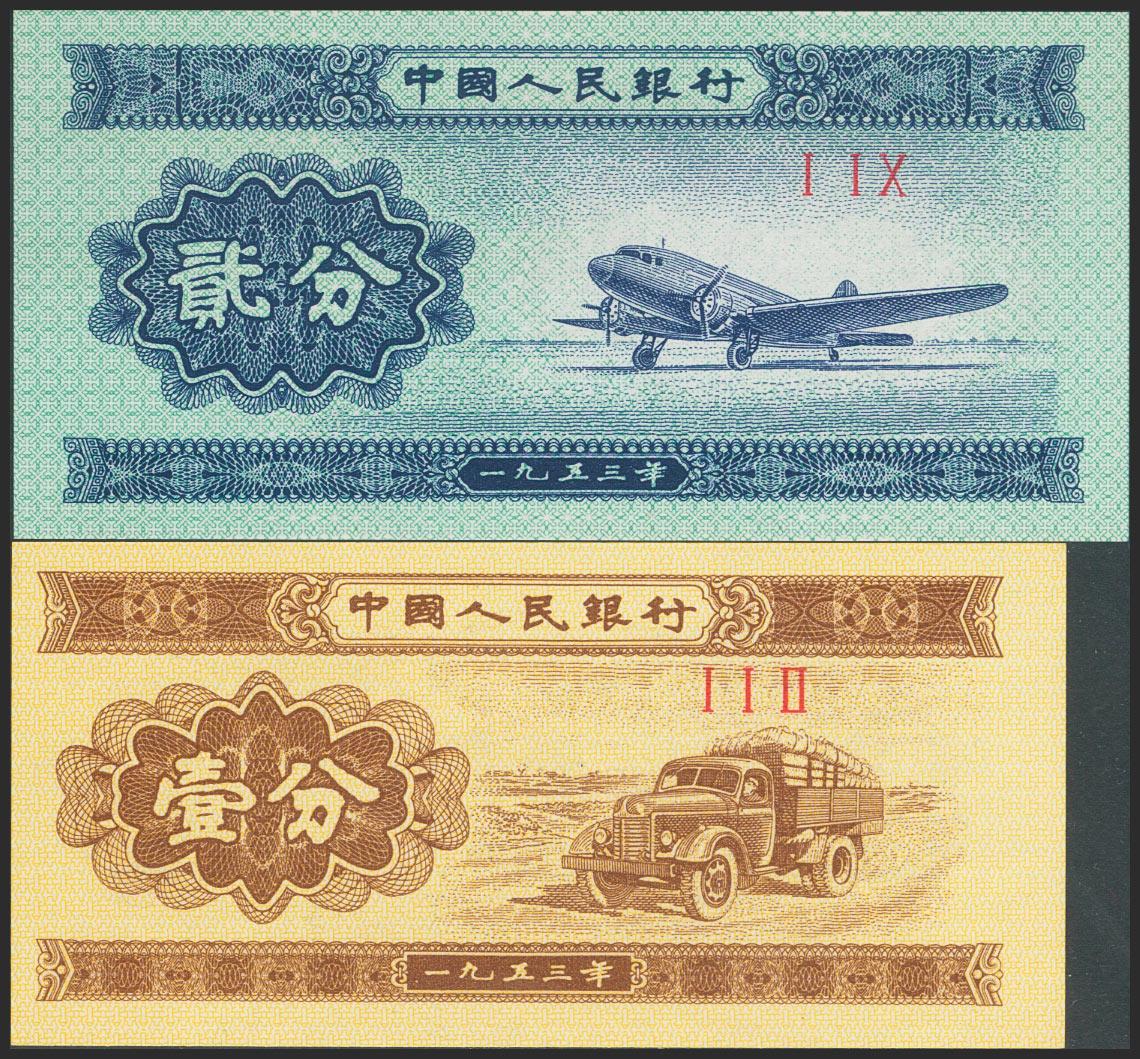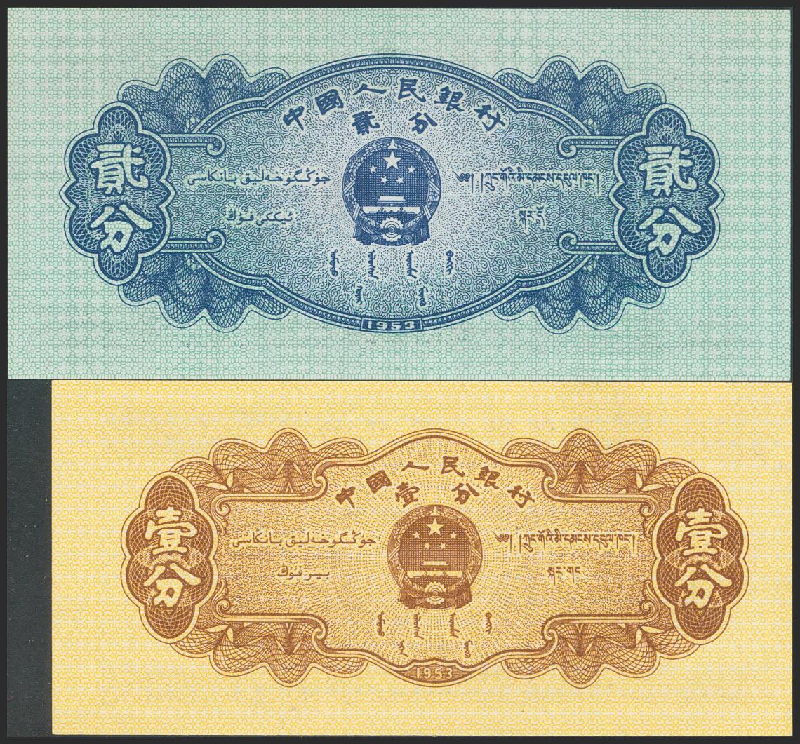 CHINA (REPUBLIC). Set of 2 banknotes: 1 Fen, 2 Fen. 1953. Peoples Bank of China. (Pick: 860b, 861b). Uncirculated.