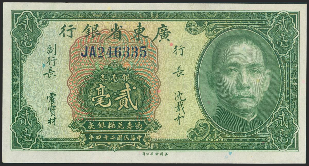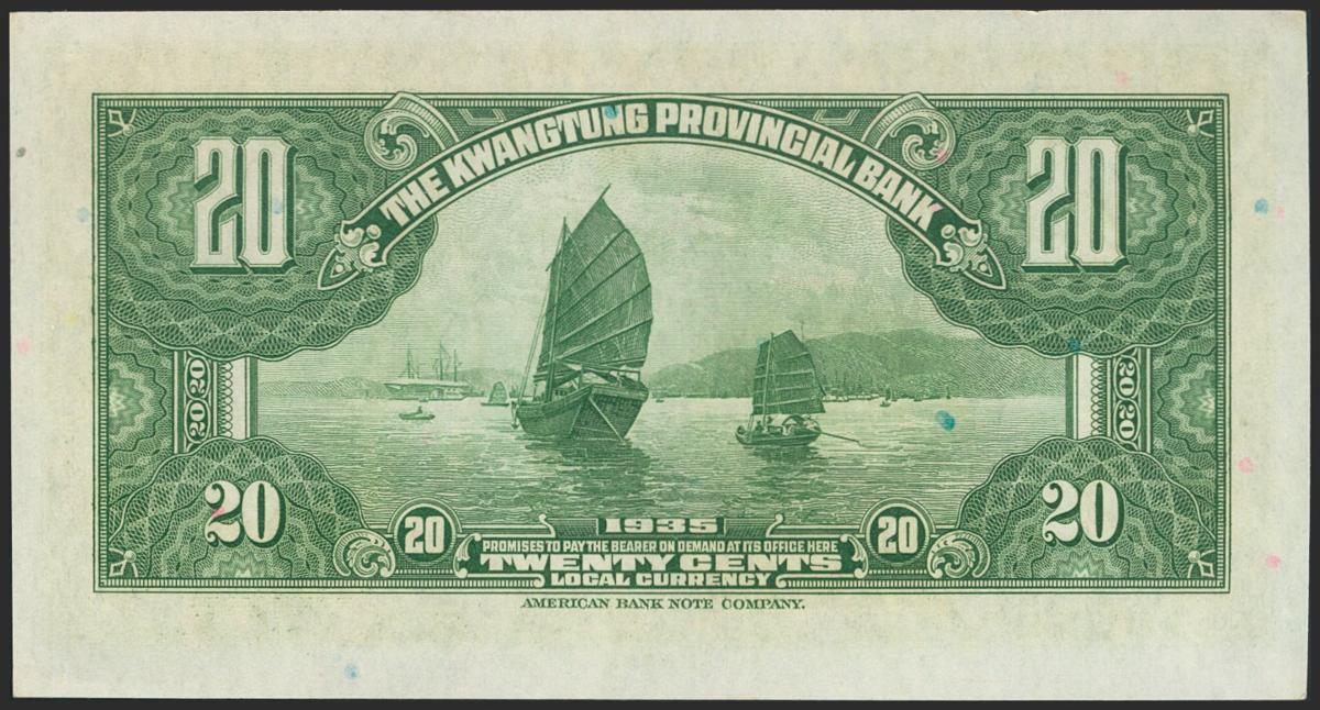 CHINA (REPUBLIC). 20 Cents. 1935. Kwangtung Provincial Bank. (Pick: S2437b). Very small nick on top edge. About Uncirculated.