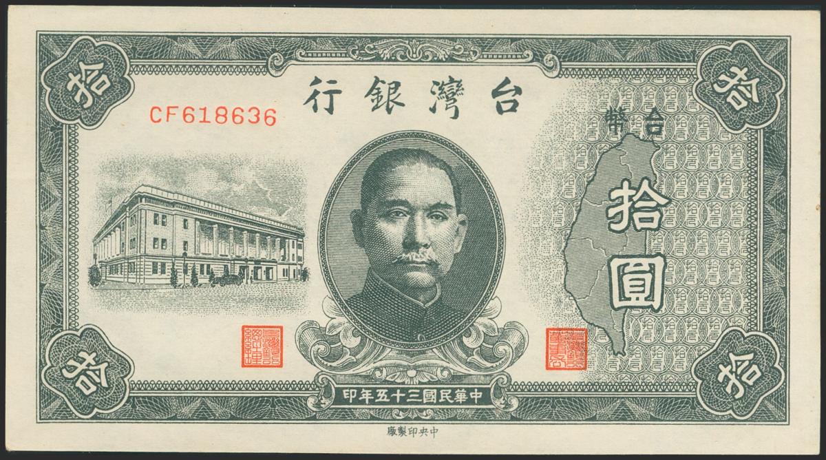 CHINA (TAIWAN). 10 Yuan. 1946. Bank of Taiwan. (Pick: 1937). About Uncirculated.