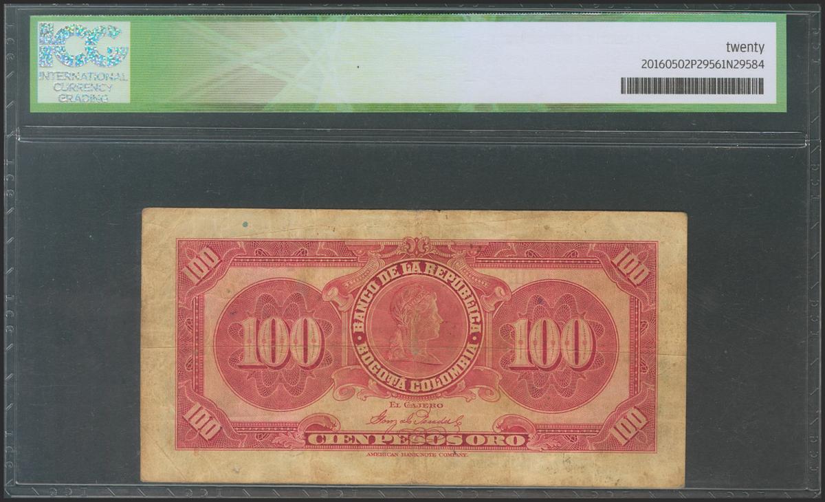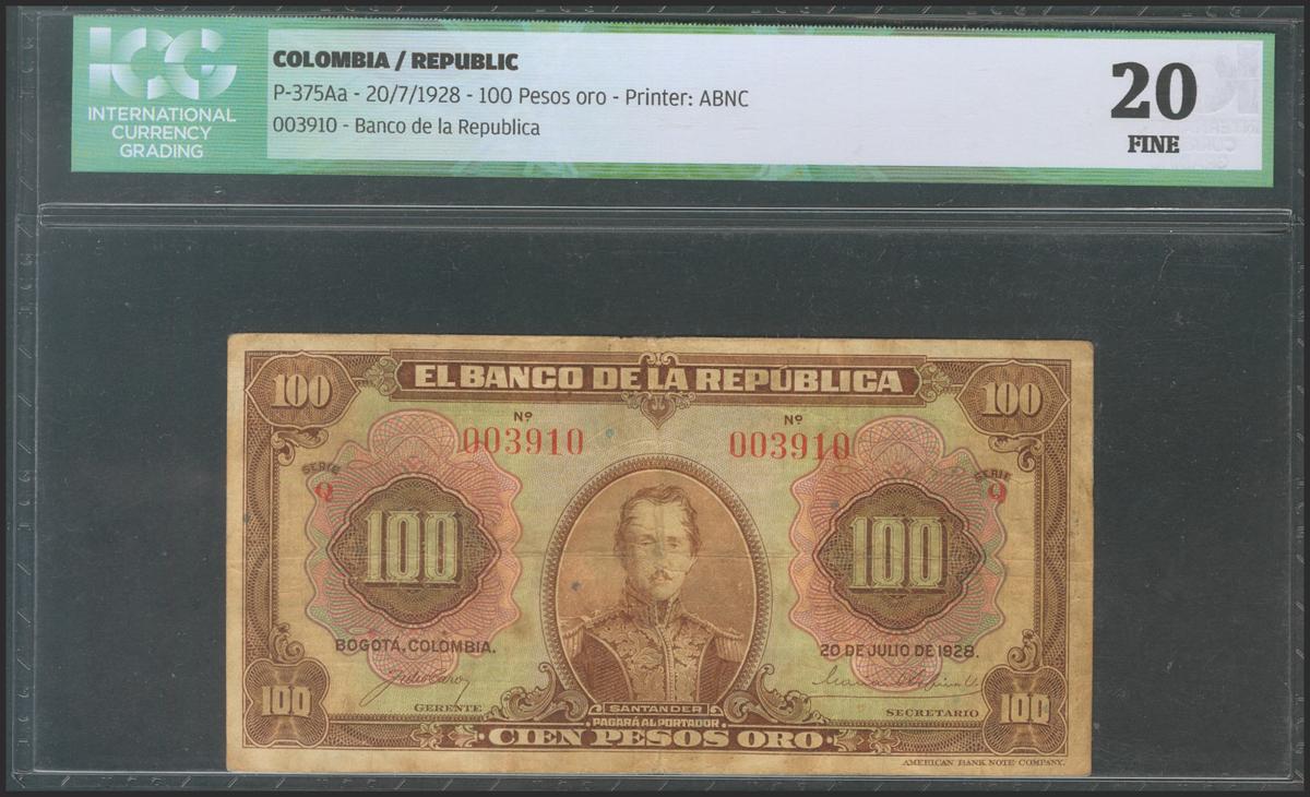 COLOMBIA. 100 Pesos Oro. 20 July 1928. Serie Q. (Pick: 375Aa). Rare. ICG20 (to get an idea of the rarity of this banknote, the last one sold was for 380 dollars (PMG25) at the auction house of Stack's Bowers Galleries).