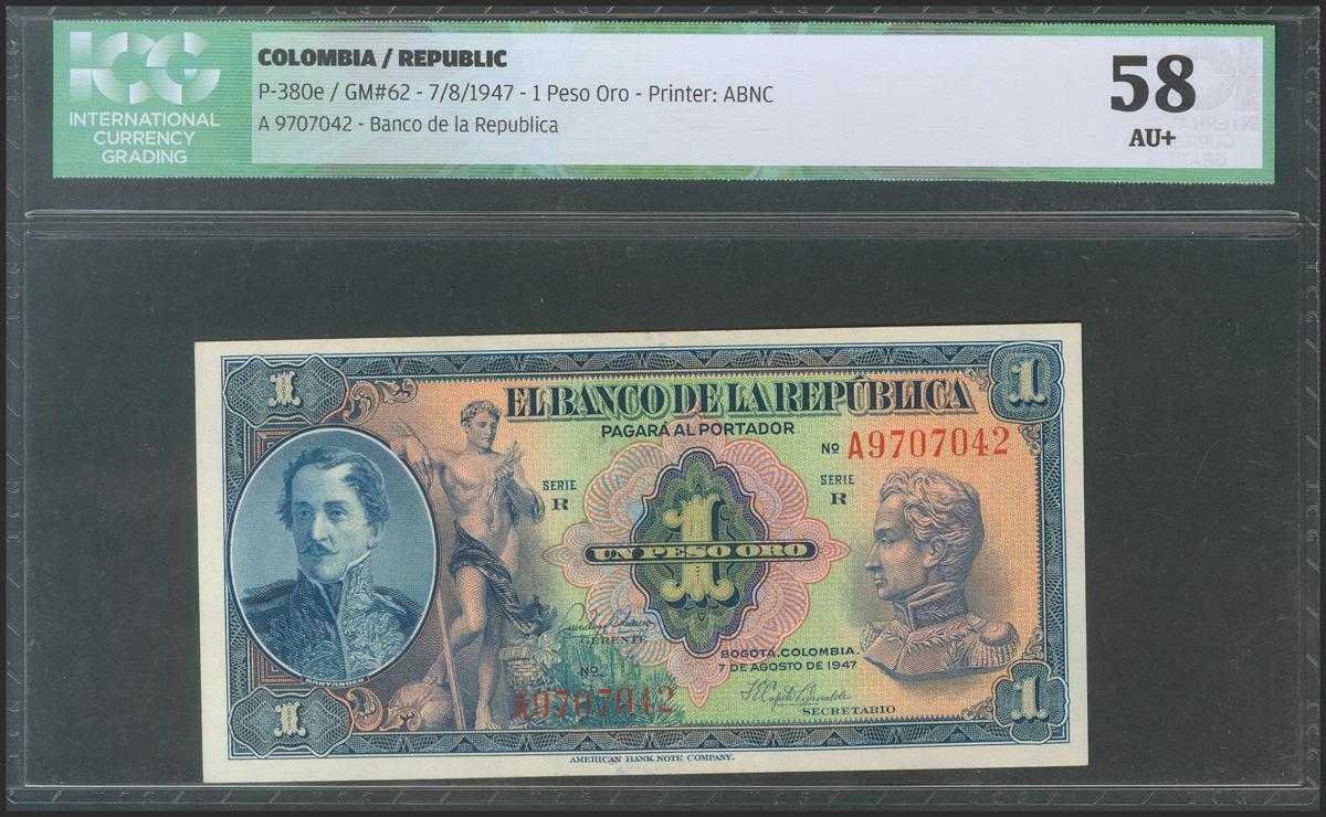 COLOMBIA. 1 Peso Oro. 7 August 1947. Serie R. (Pick: 380e). ICG58.