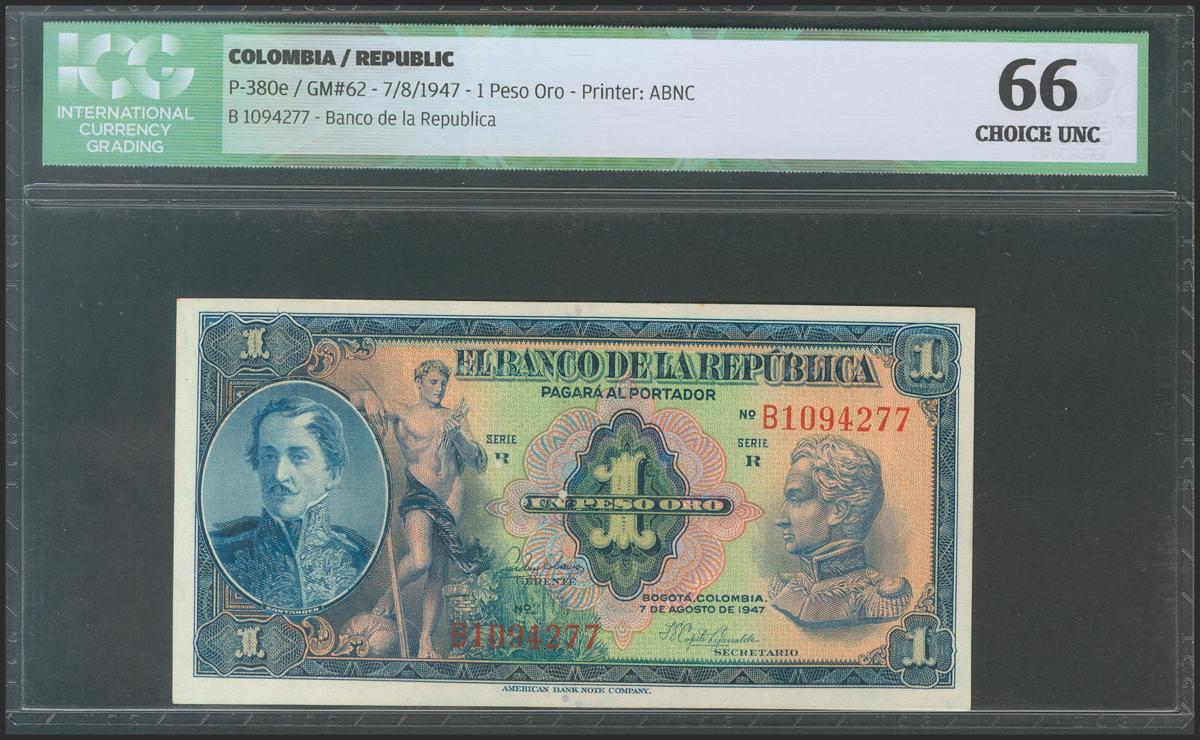 COLOMBIA. 1 Peso Oro. 7 August 1947. Serie R. (Pick: 380e). ICG66.