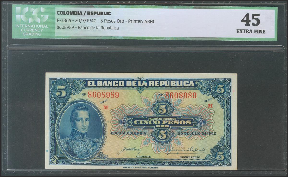 COLOMBIA. 5 Pesos Oro. 20 July 1940. Serie M. (Pick: 386a). ICG45.