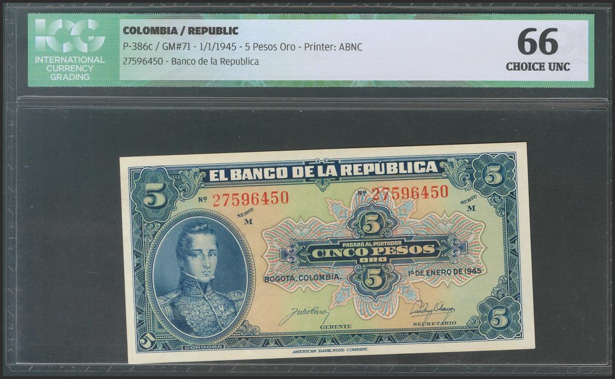 COLOMBIA. 5 Pesos Oro. 1 January 1945. Serie M. (Pick: 386c). ICG66.