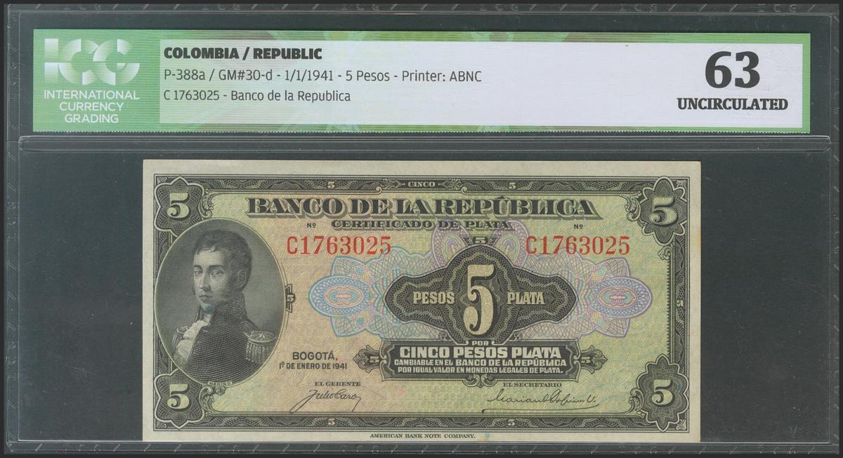 COLOMBIA. 5 Pesos. 1 January 1941. Serie C. (Pick: 388a). ICG63.