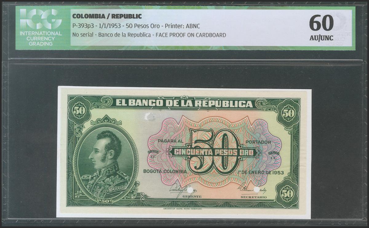 COLOMBIA. 50 Pesos Oro. 1 January 1953. Serie CC. Face proof. (Pick: 393p3). ICG60.