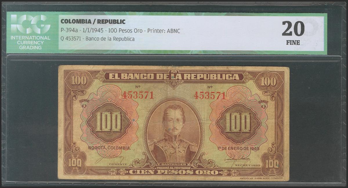 COLOMBIA. 100 Pesos Oro. 1 January 1945. Serie Q. (Pick: 394a). ICG20.