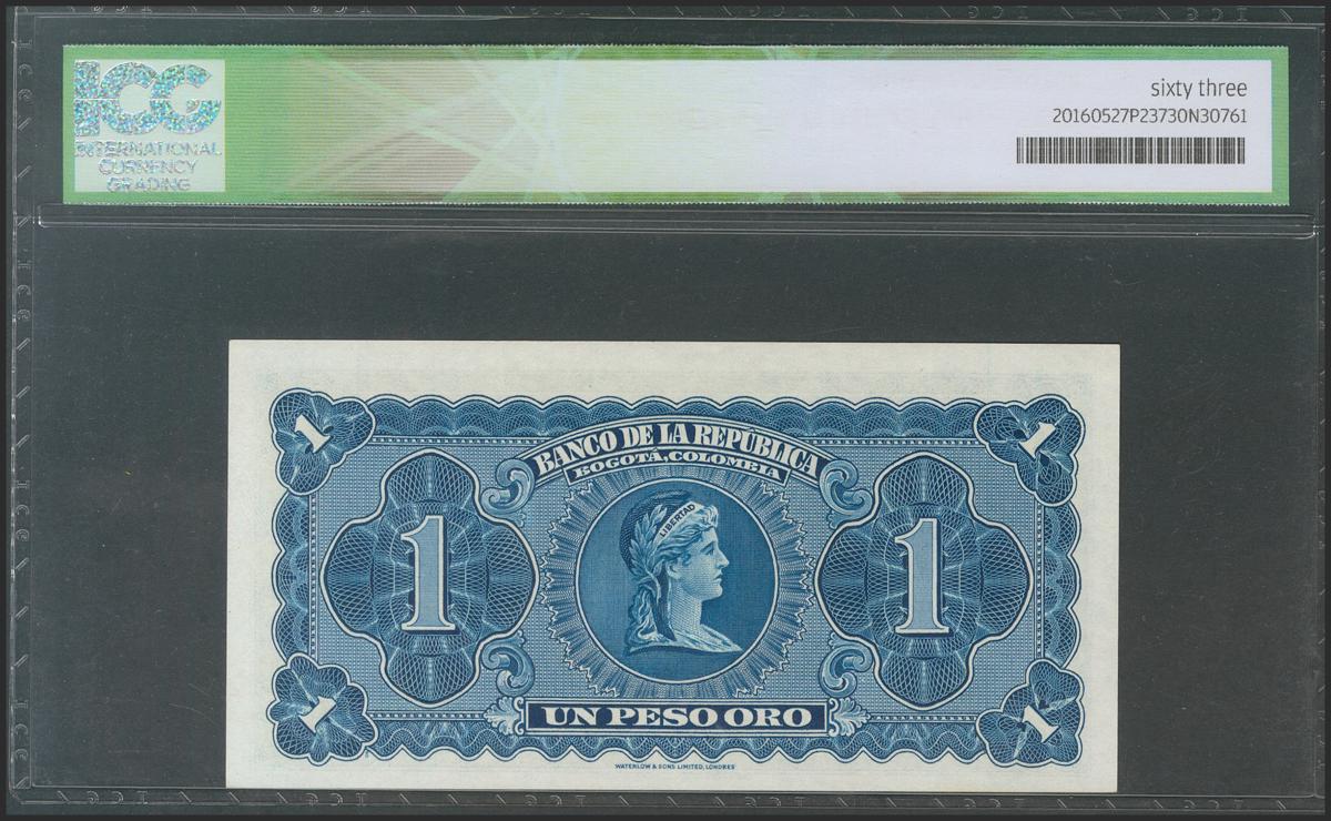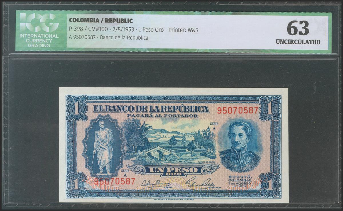 COLOMBIA. 1 Peso Oro. 7 August 1953. Serie A. (Pick: 398). ICG63.