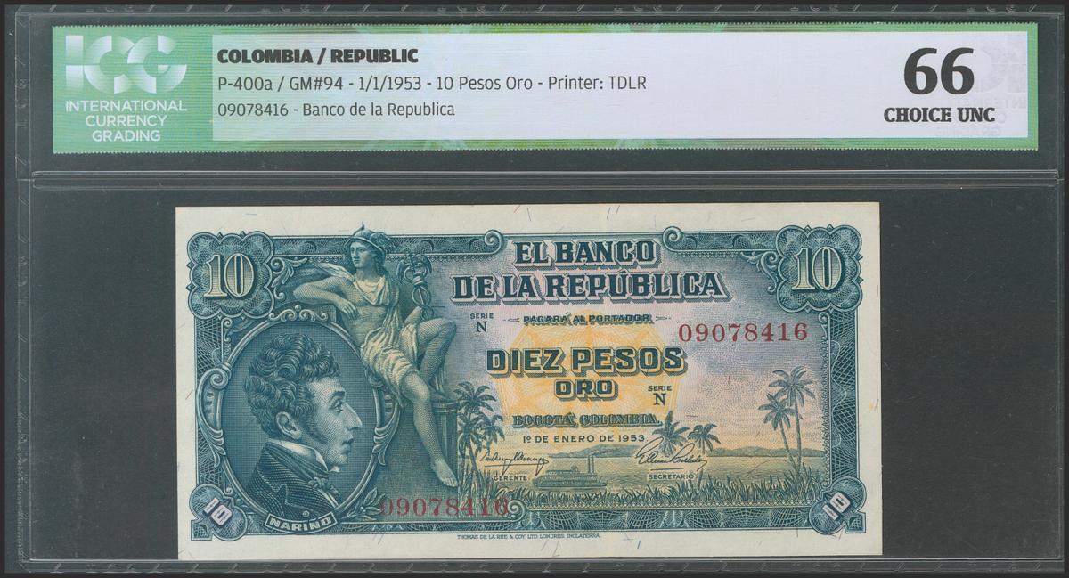 COLOMBIA. 10 Pesos Oro. 1 January 1953. Serie N. (Pick: 400a). ICG66.