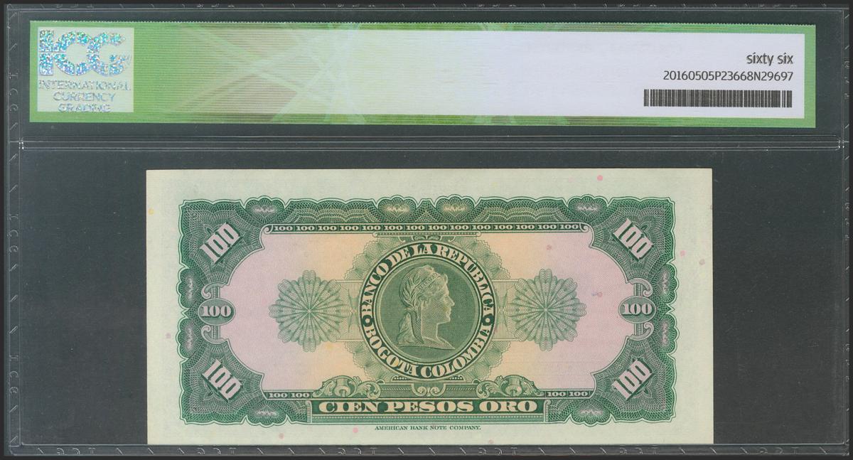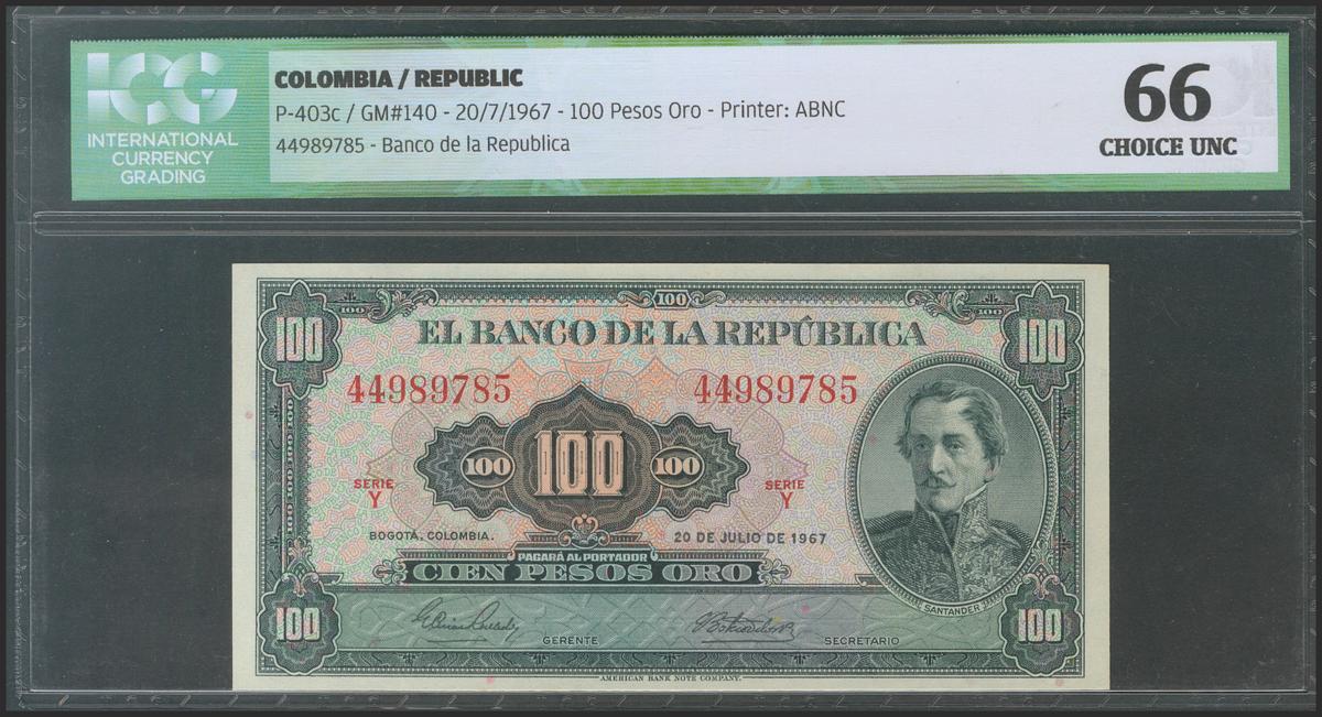 COLOMBIA. 100 Pesos Oro. 20 July 1967. Serie Y. (Pick: 403c). ICG66.