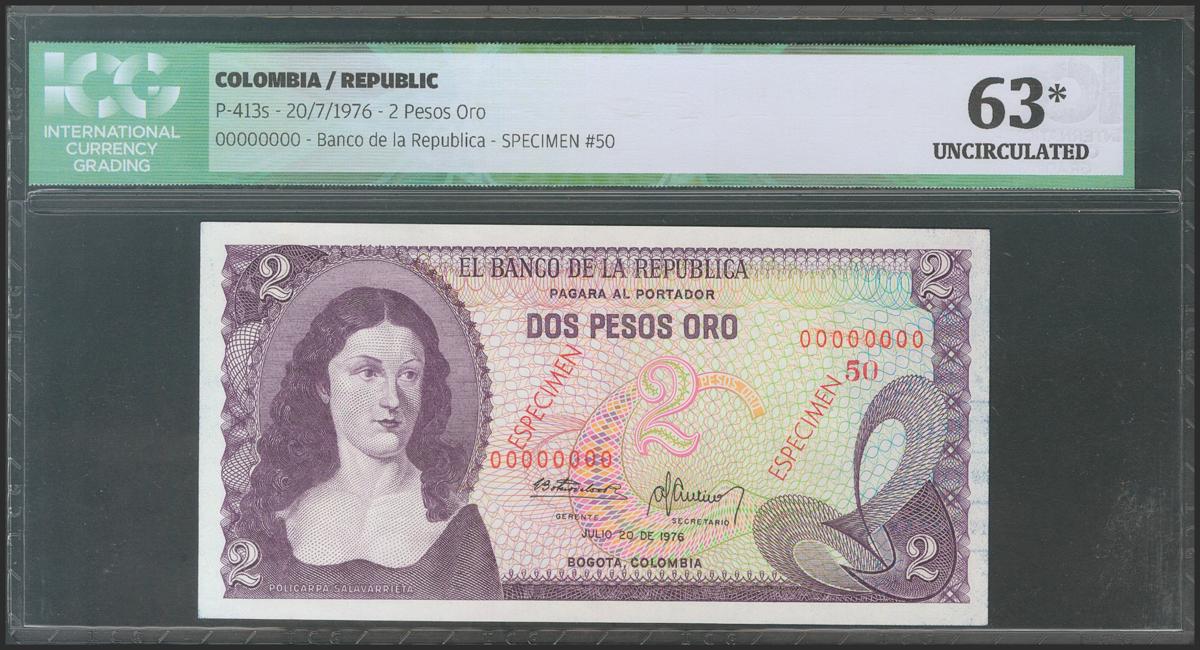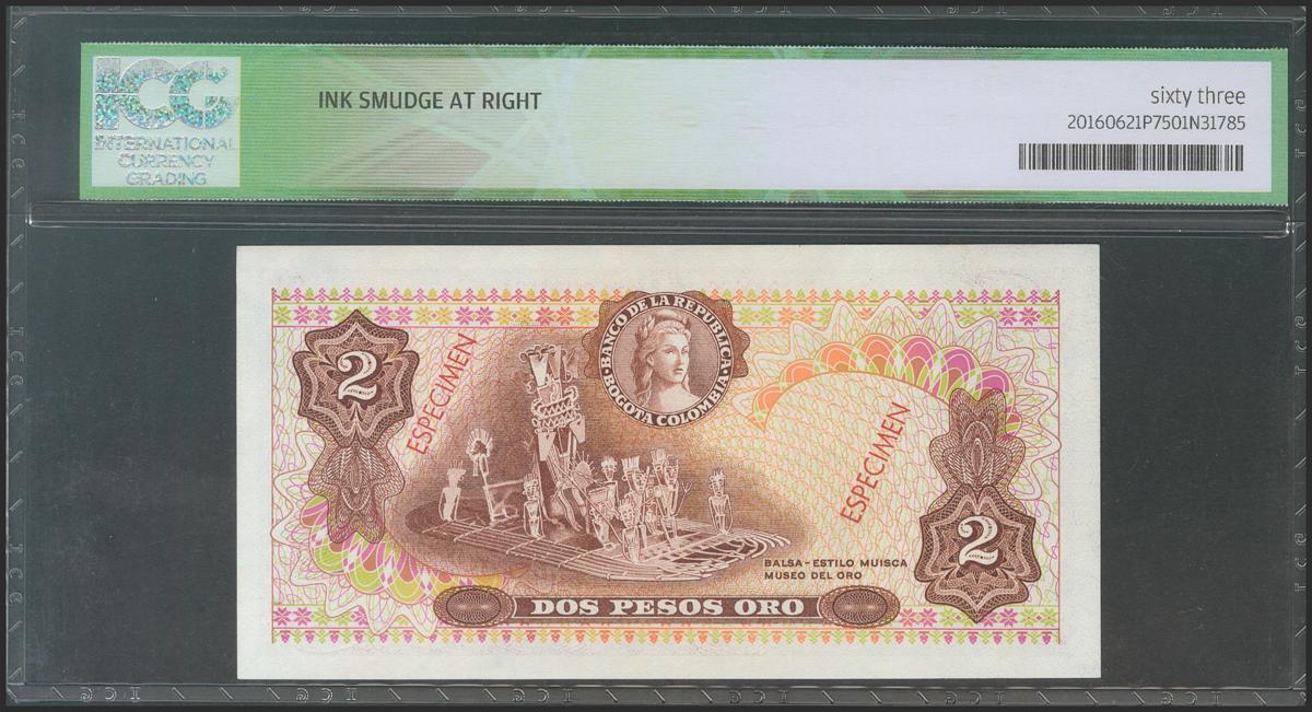 COLOMBIA. 2 Pesos Oro. 20 July 1976. Specimen. (Pick: 413s). ICG63*(Ink smudge at right).