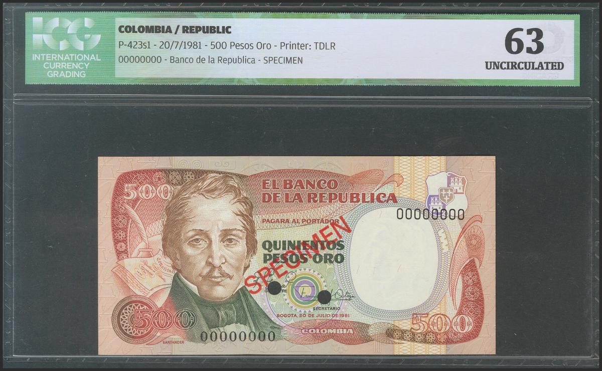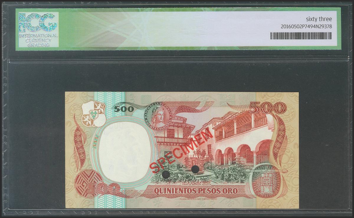 COLOMBIA. 500 Pesos Oro. 20 July 1981. Specimen. (Pick: 423s1). ICG63.
