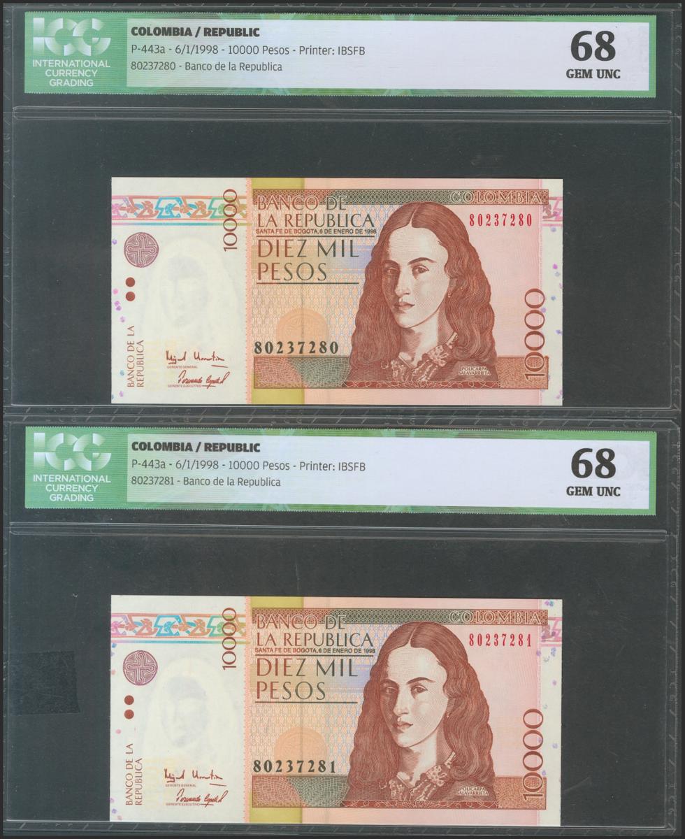 COLOMBIA. 10000 Pesos. 6 January 1998. Correlative couple. (Pick: 443a). ICG68.