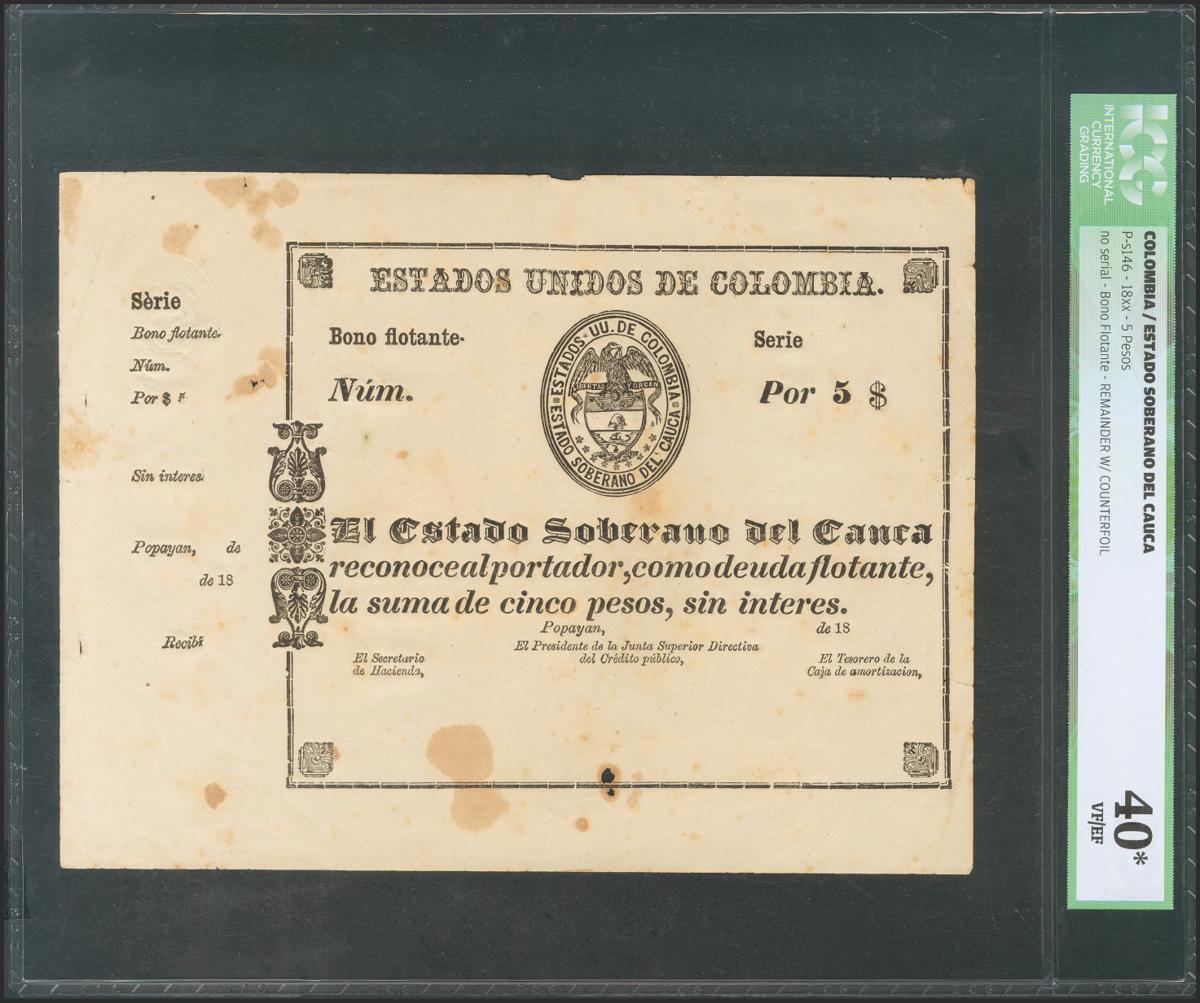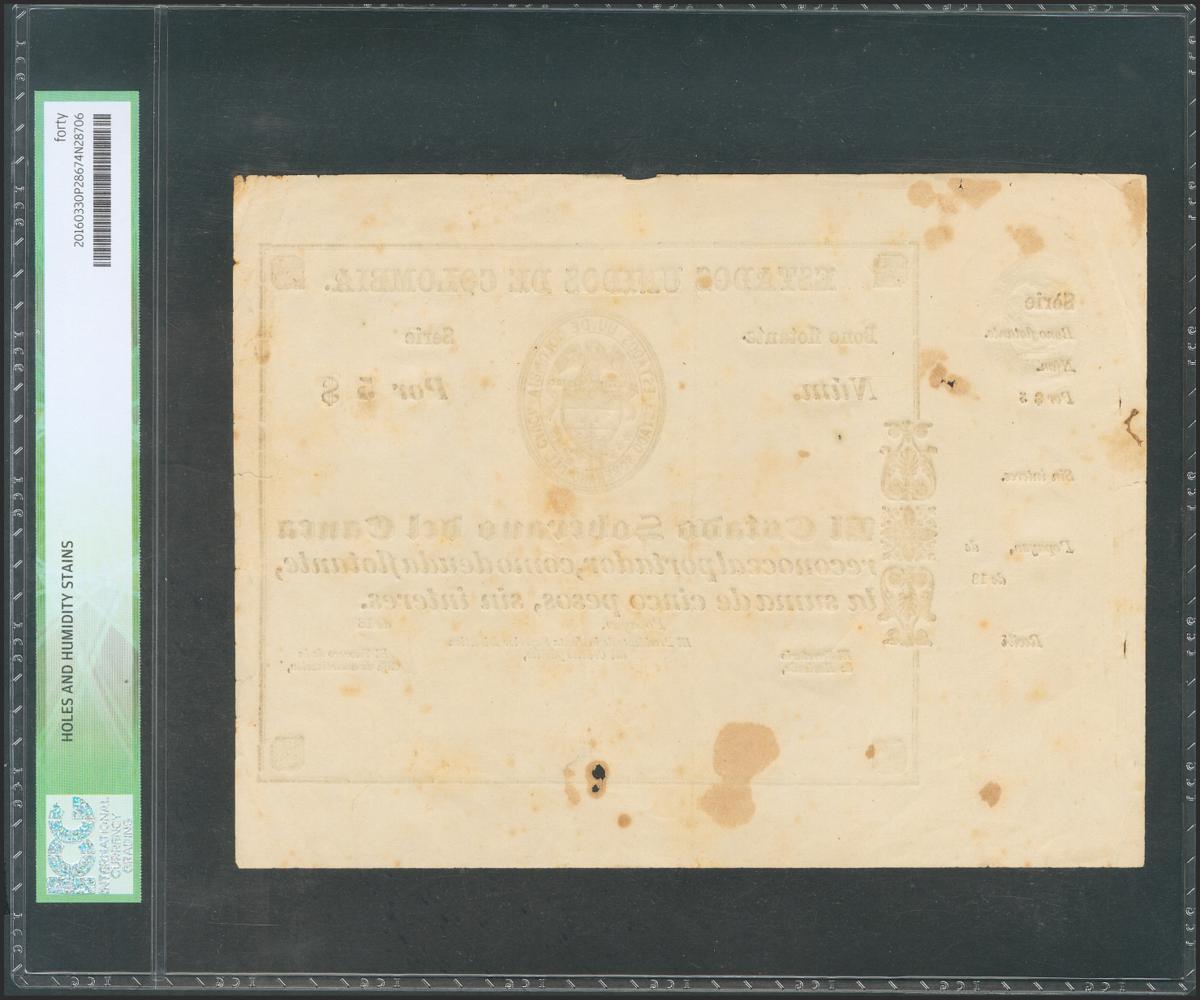 COLOMBIA. 5 Pesos. (1800ca). Counterfoil. (Pick: s146). ICG40 (Holes and humidity stains).