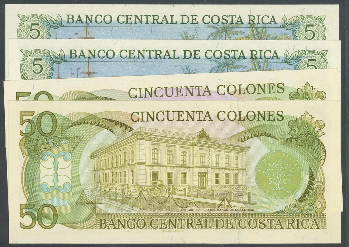 COSTA RICA. Set of 4 banknotes: 5 Colones (2), 50 Colones (2). 1981-1993. (Pick: 236d(2), 253, 257). Uncirculated.