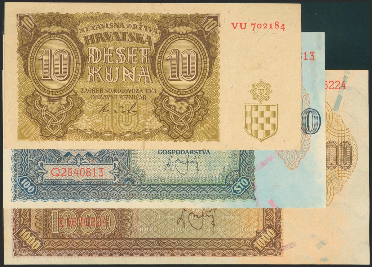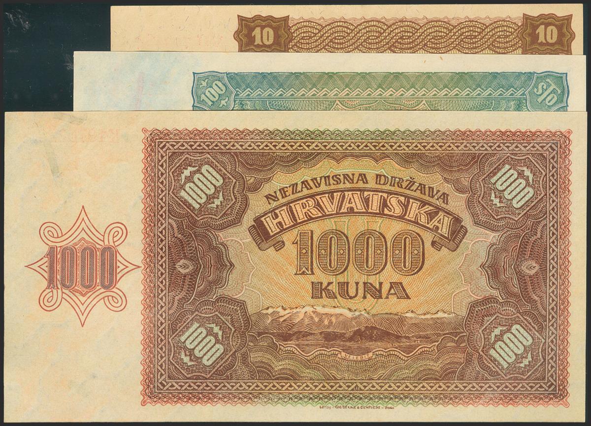 CROATIA. Set of 3 banknotes: 10 Kuna, 100 Kuna, 1000 Kuna. 1941. (Pick: 2, 4a, 5b). Extremely Fine to Uncirculated.