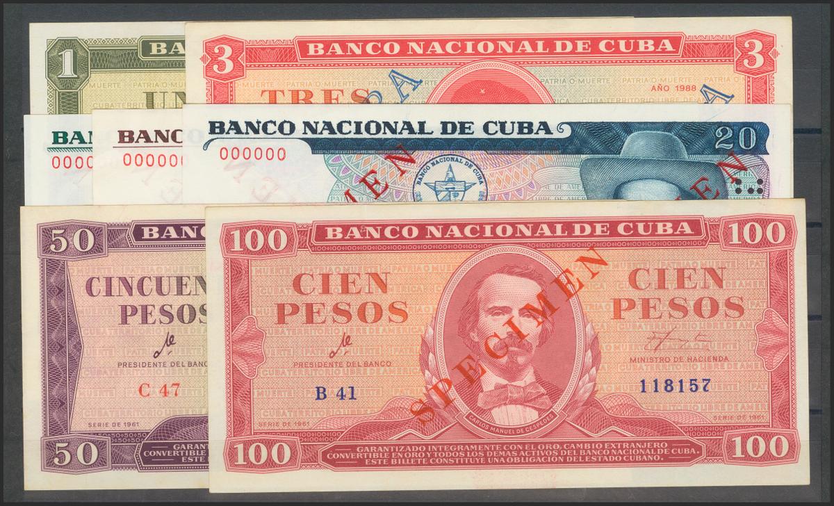 CUBA. Set of 7 banknotes of 1 Peso, 3 Pesos, 5 Pesos, 10 Pesos, 20 Pesos, 50 Pesos and 100 Pesos. (1961ca). SPECIMENS. (Pick: 98s, 99s, 102s3, 104bs2, 108s, 109s, 110s). About Uncirculated/Uncirculated.