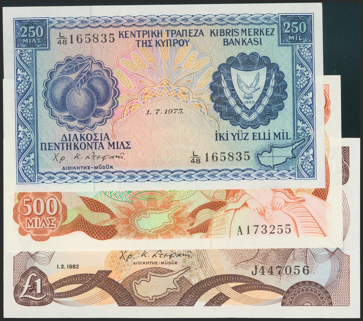 CYPRUS. Set of 3 banknotes: 250 Mils, 500 Mils, 1 Pound. 1975-1982. (Pick: 41c, 45a, 46). Uncirculated.