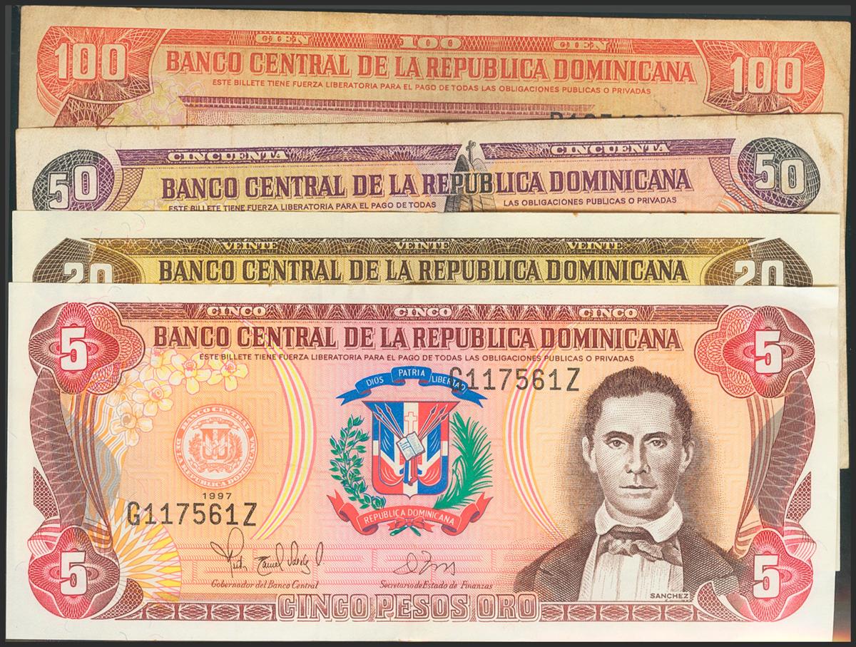 DOMINICAN REPUBLIC. Set of 4 banknotes: 5 Pesos, 20 Pesos, 50 Pesos, 100 Pesos. 1992-1997. (Pick: 139a, 149a, 150a, 152b). Very Fine to Extremely Fine. TO EXAM.