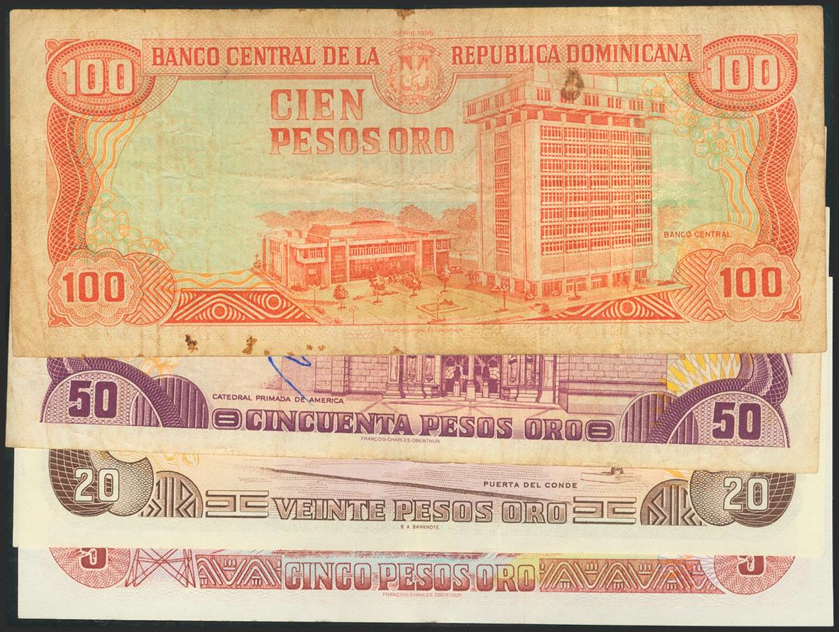 DOMINICAN REPUBLIC. Set of 4 banknotes: 5 Pesos, 20 Pesos, 50 Pesos, 100 Pesos. 1992-1997. (Pick: 139a, 149a, 150a, 152b). Very Fine to Extremely Fine. TO EXAM.