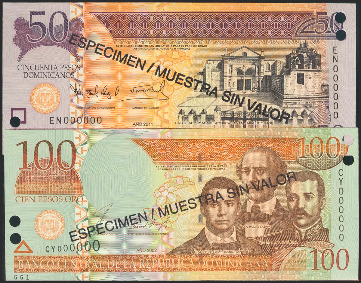 DOMINICAN REPUBLIC. Set of 2 banknotes: 50 Pesos and 100 Pesos. 2002-2011. Specimens. (Pick: 167s2, 183s). Punch holes cancelled. Uncirculated.
