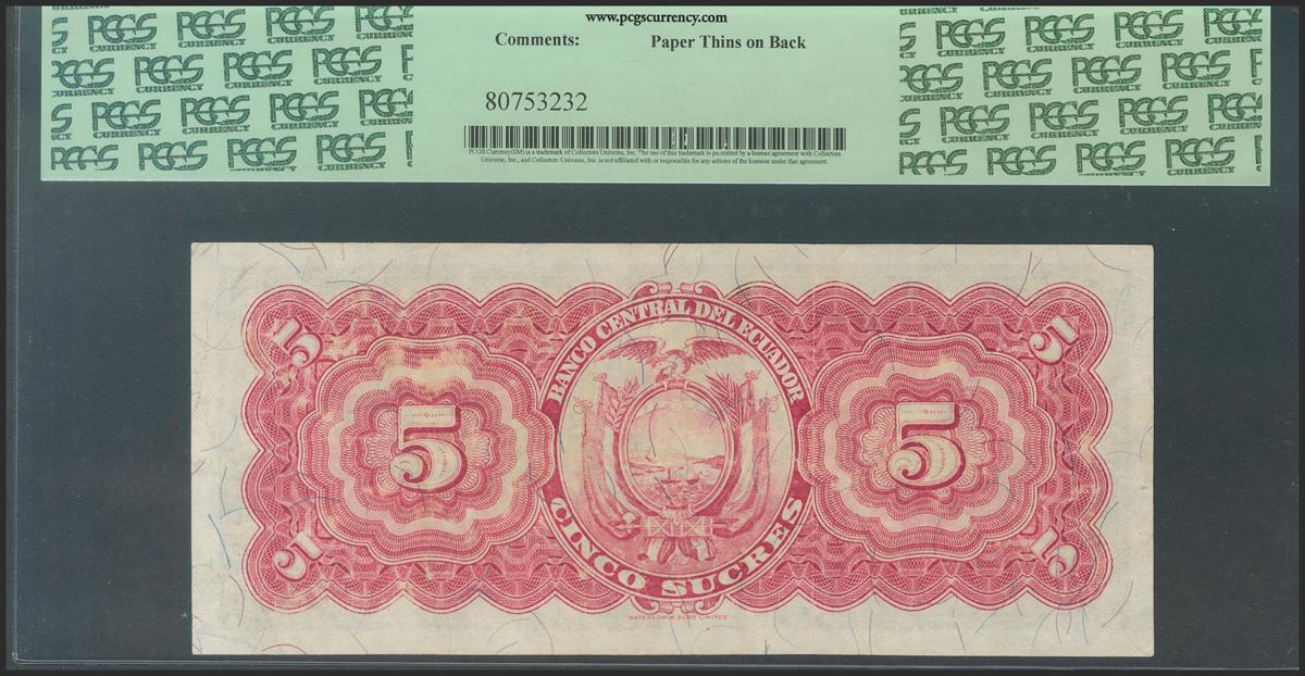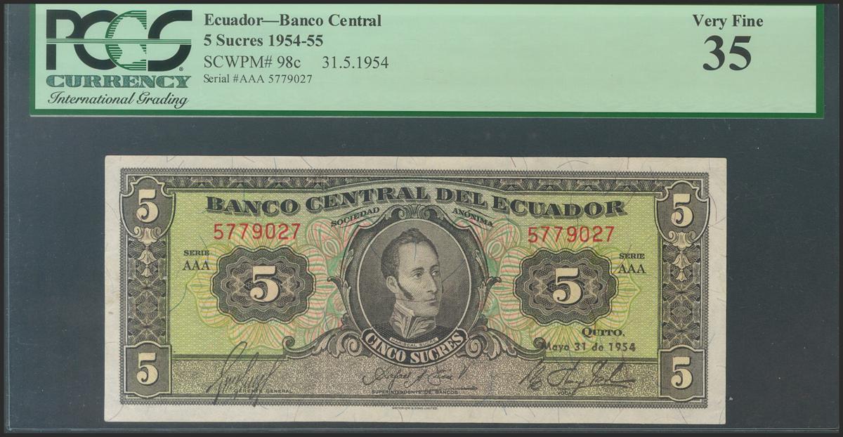 ECUADOR. 5 Sucres. 31 May 1954. Serie AAA. (Pick: 98c). PCGS35.
