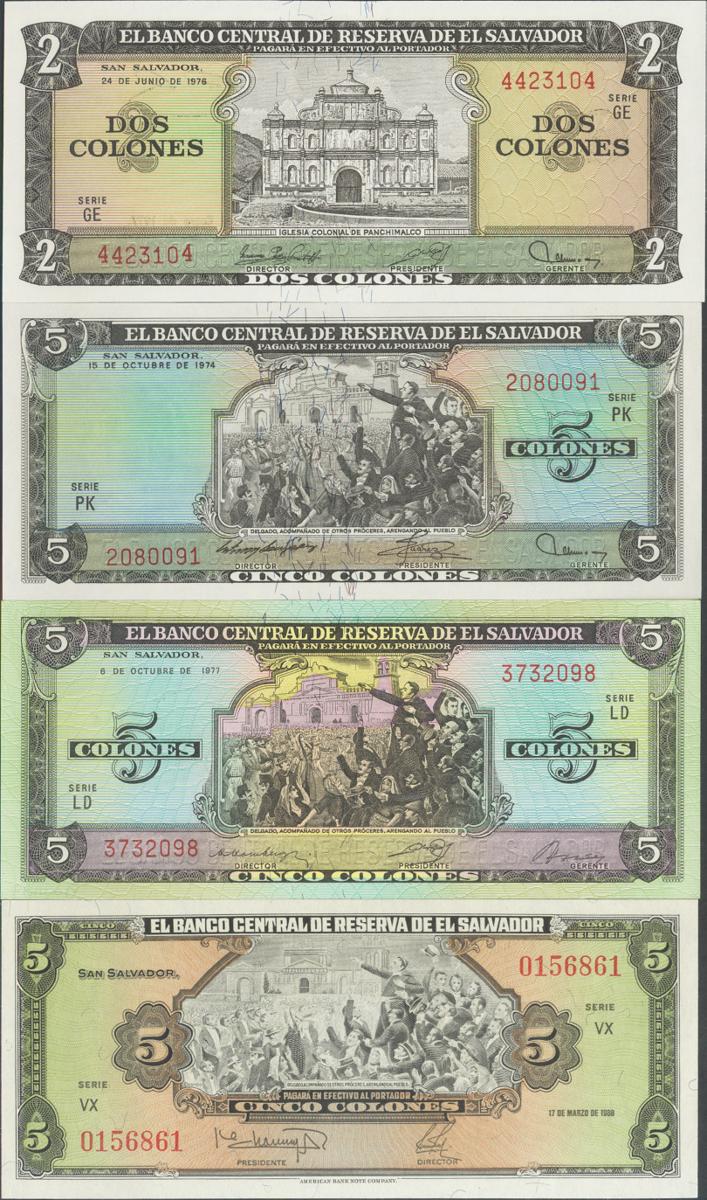EL SALVADOR. Set of 6 banknotes: 2 Colones, 5 Colones (3), 10 Colones, 25 Colones. 1974-1988. (Pick: 117a, 124a, 126a, 129b, 130a, 134b). Uncirculated.