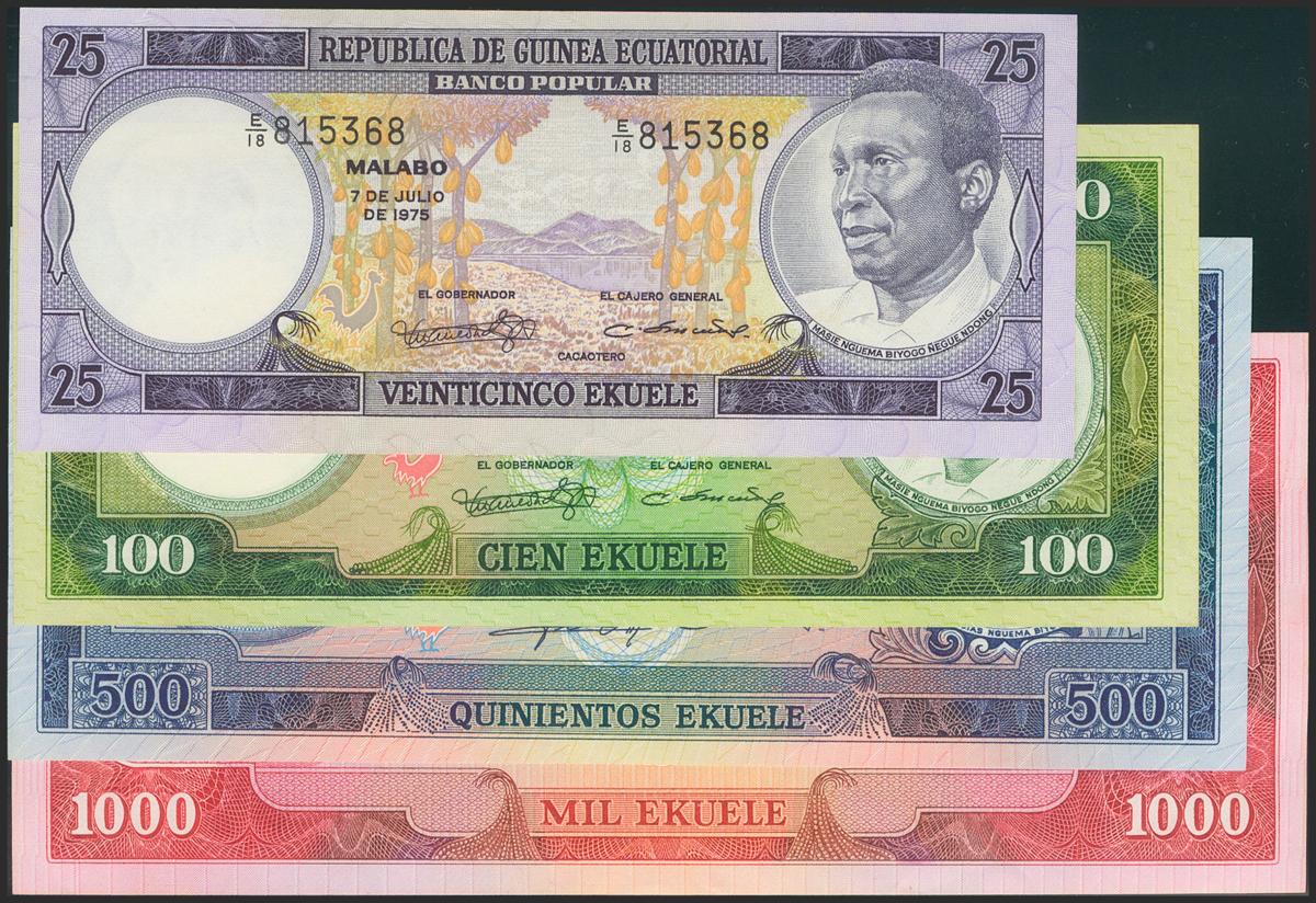 EQUATORIAL GUINEA. Set of 4 banknotes: 25 Ekuele, 100 Ekuele, 500 Ekuele, 1000 Ekuele. 1975. (Pick: 4, 6, 7, 8). Uncirculated.