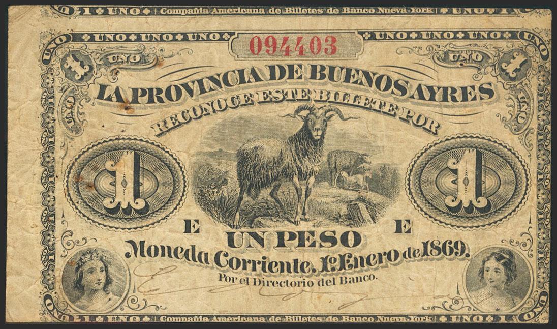 ARGENTINA. 1 Peso. 1869. Provincia de Buenos Aires. (Pick: S481a). Rare. Pinholes. Fine.