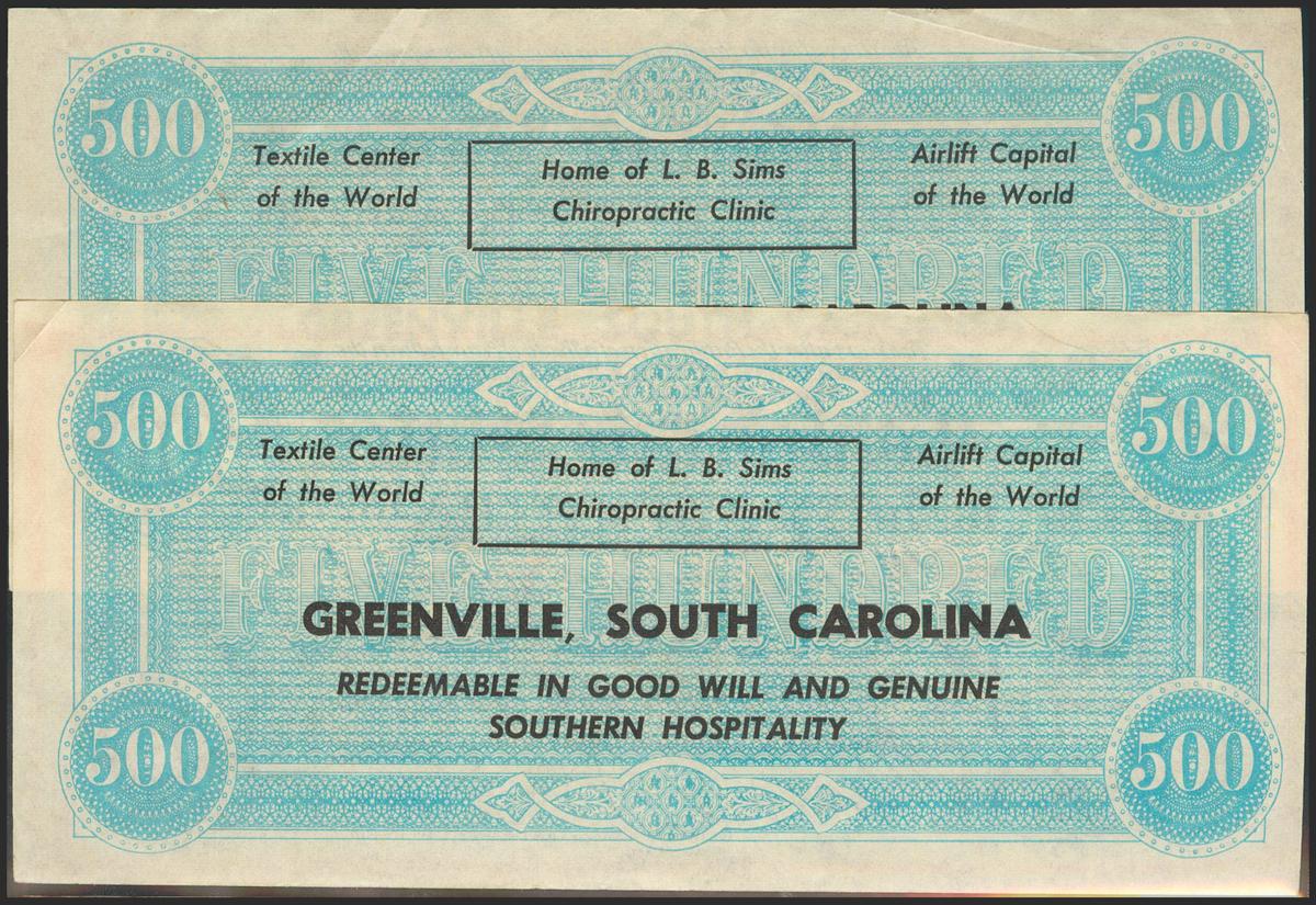 FANTASY. Set of 2 banknotes from 500 Dollars (2). No Date. Advertising note from Greenville, South Carolina. (Pick: Not Listed). Very Fine to Extremely Fine.