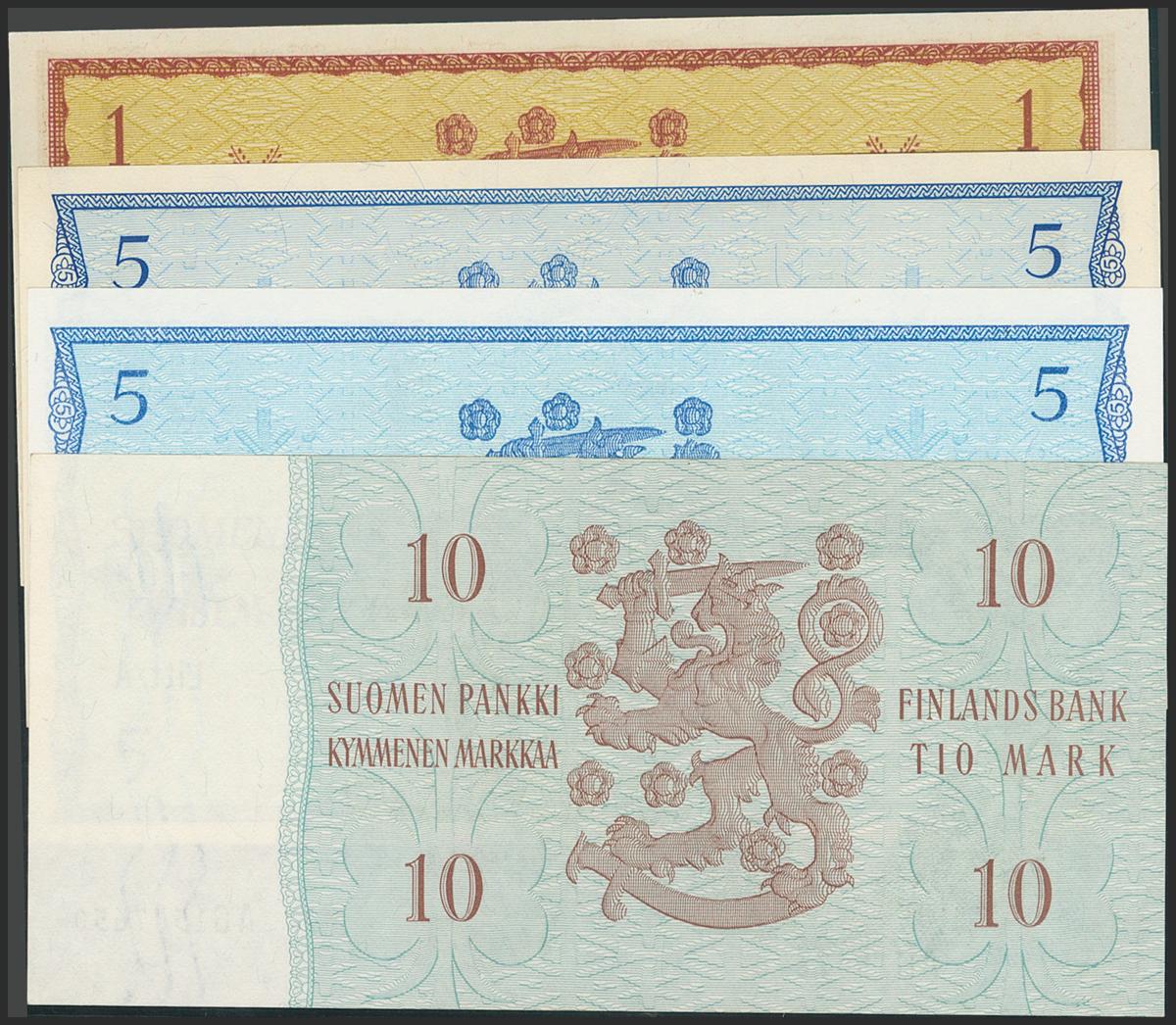 FINLAND. Set of 4 banknotes: 1 Markkaa, 5 Markkaa (2), 10 Markkaa. 1963. (Pick: 98a, 99a, 104a, 106Aa). Uncirculated.