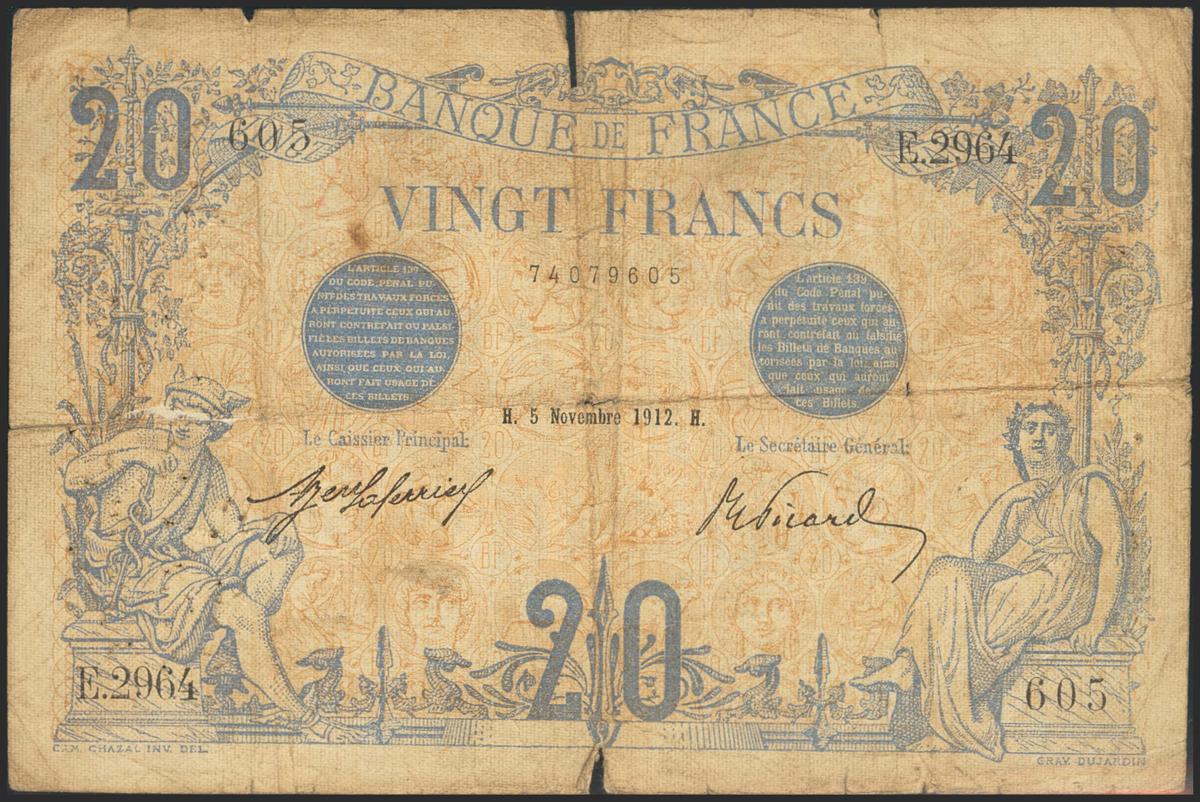 FRANCE. 20 Francs. 1912. (Pick: 68b). Rare. Good.