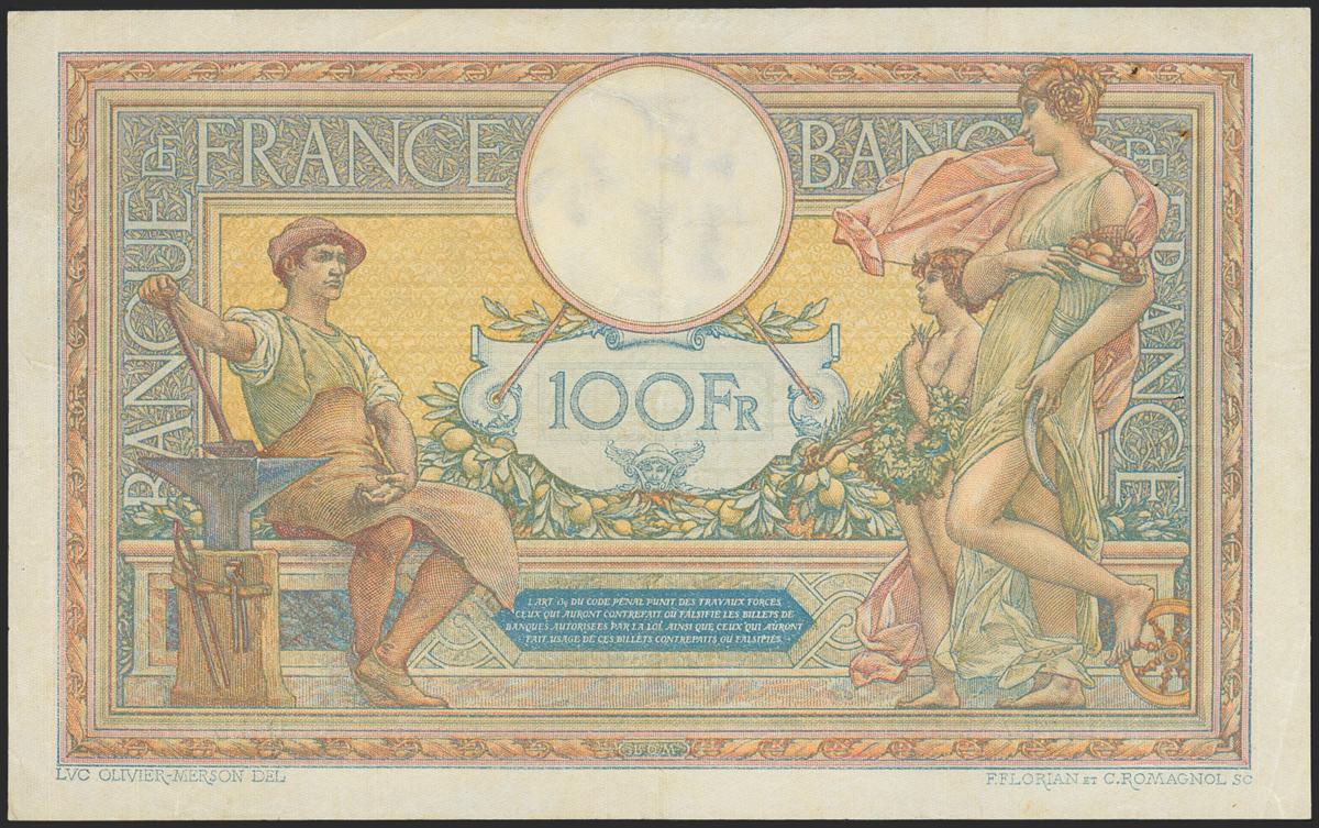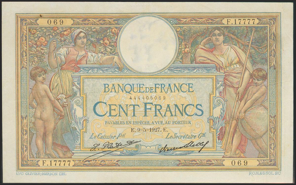 FRANCE. 100 Francs. 1927. (Pick: 78b). Pinholes on the left, very appealing and pleasing banknote. Very Fine.