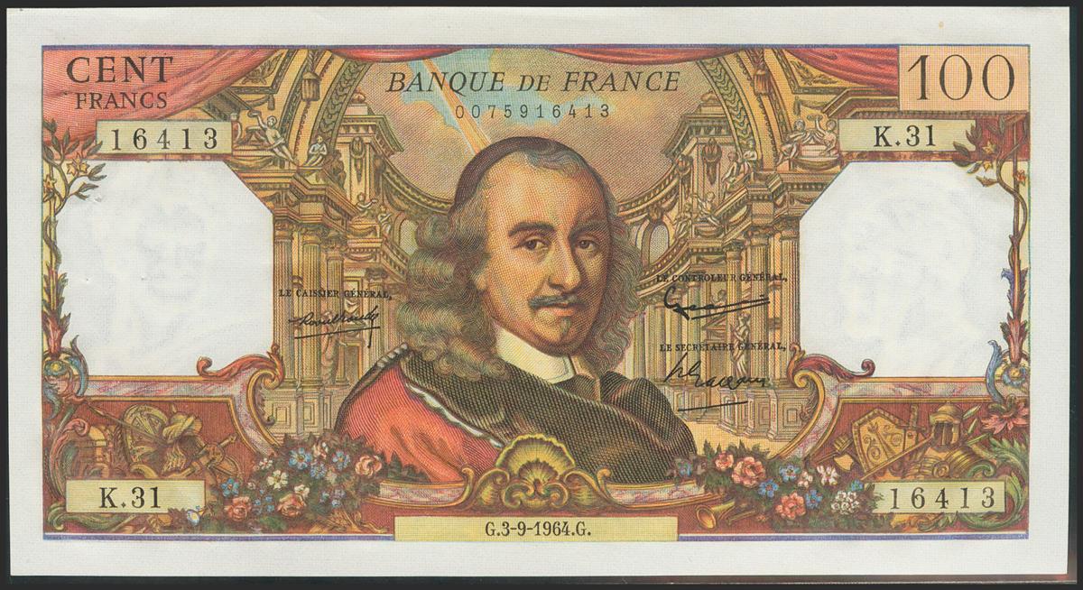 FRANCE. 100 Francs. 1964. (Pick: 149a). Six pinholes on left, paper waves. Better than Extremely Fine.