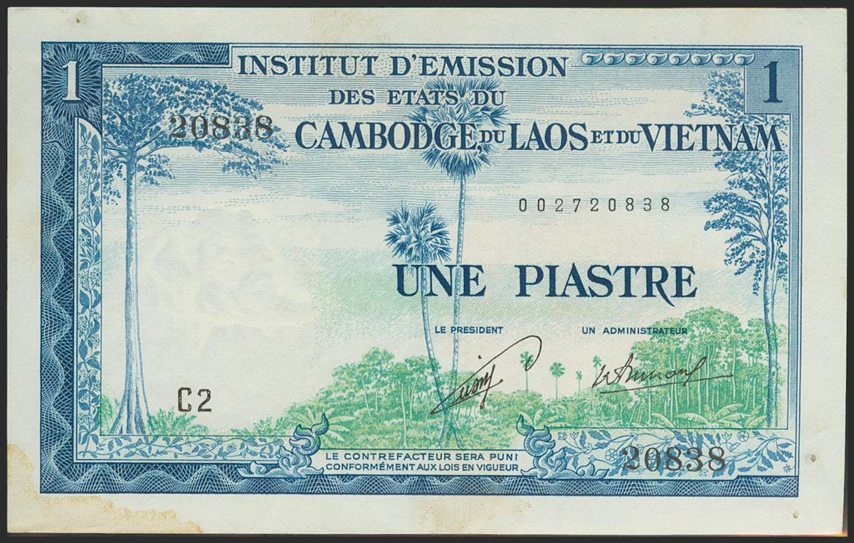 FRENCH INDOCHINA. 1 Piastre. 1954. (Pick: 100). Pinholes, bottom left corner stained. Extremely Fine.