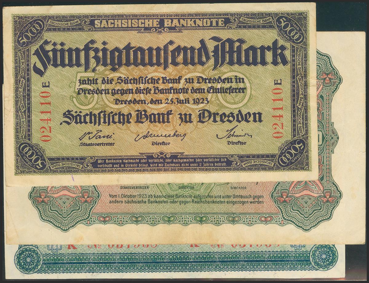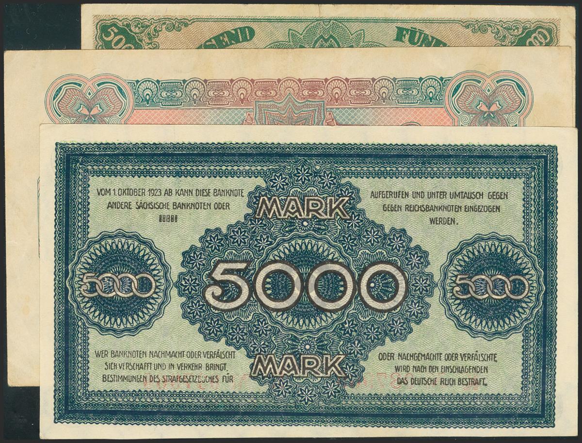 GERMANY. Set of 3 banknotes: 5000 Mark, 10000 Mark, 50000 Mark. 1923. Die Sächsische Bank. (Pick: S957, S958, S959). Very Fine to About Uncirculated.