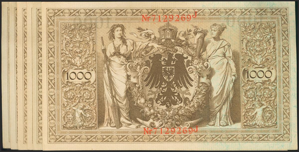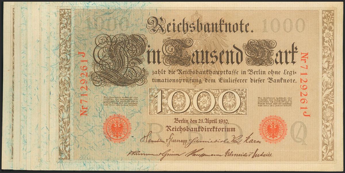 GERMANY. Set of 9 banknotes of 1000 Mark. 1910. Correlative run. Underprint letter Q. Series J. (Pick: 44b). Uncirculated.