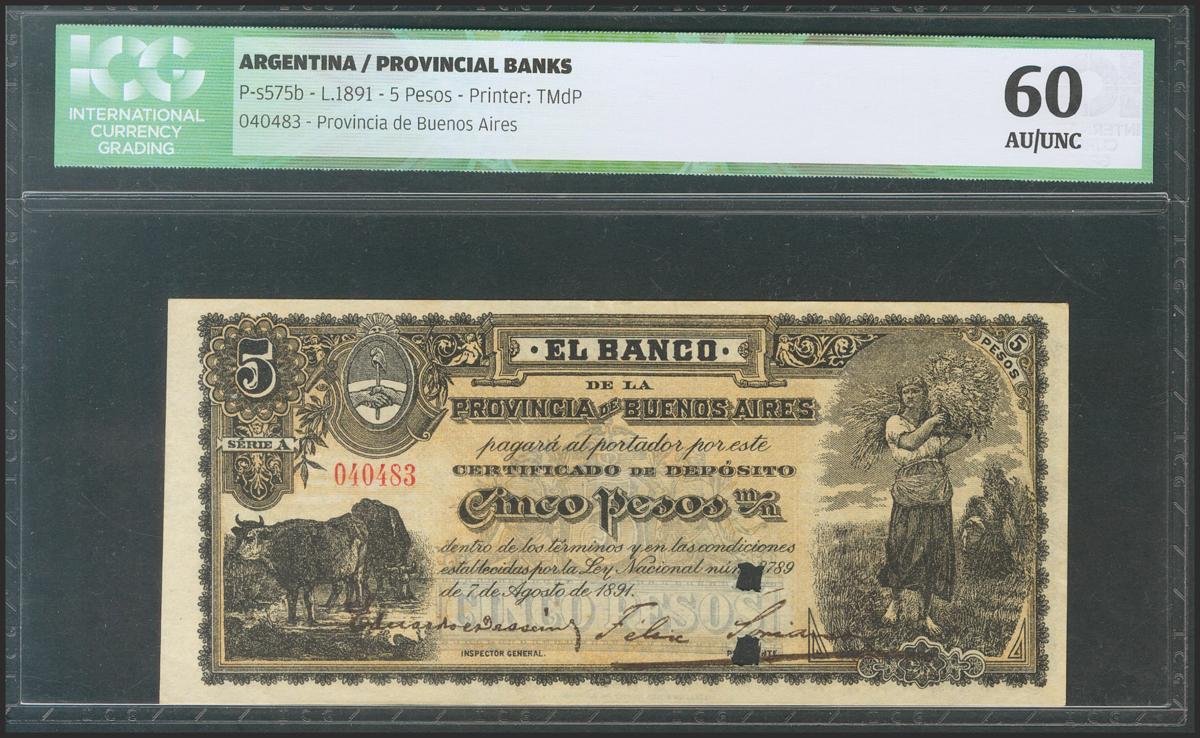 ARGENTINA. 5 Pesos. 1891. Serie A. (Pick: s575b). ICG60.