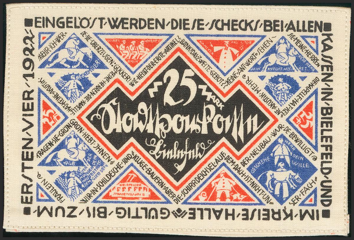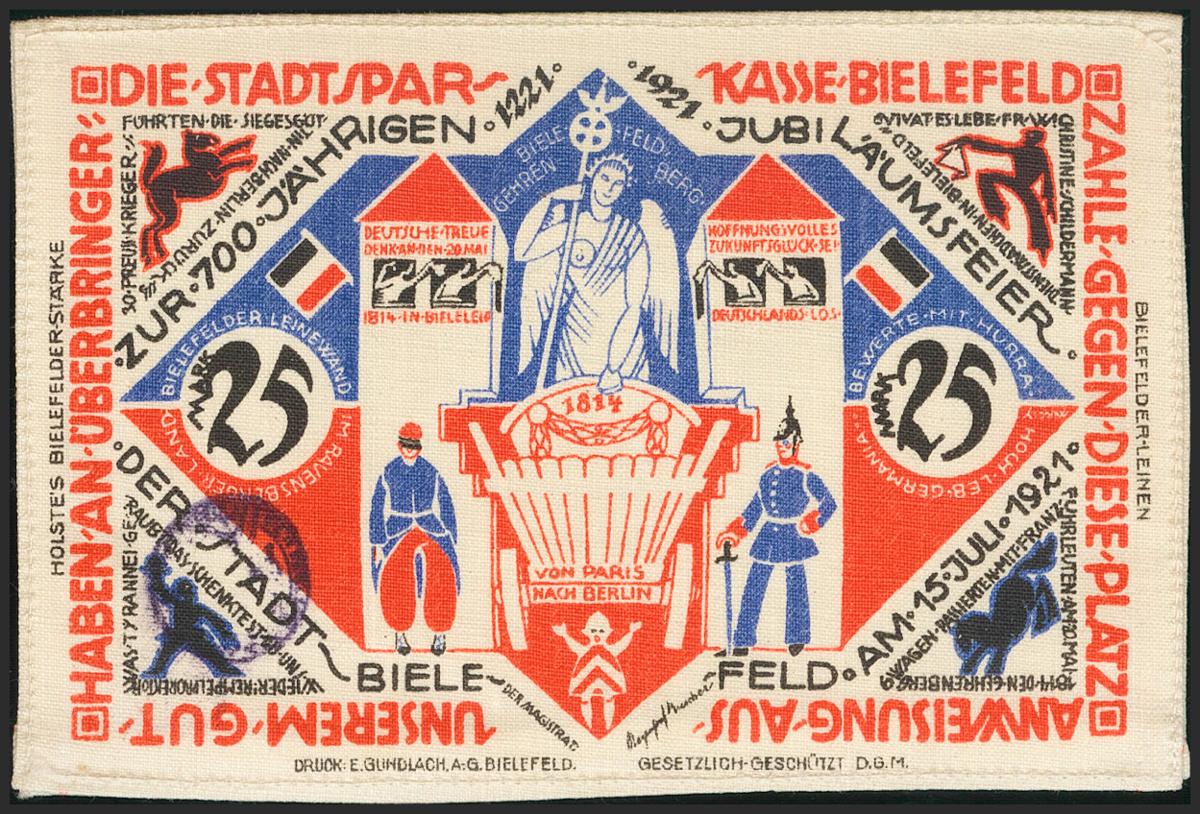 GERMANY. NOTGELD (BIELEFELD). 25 Mark. 1921. Linen. With round stamp, no serial number. (Grabowski 103.11g). Uncirculated.