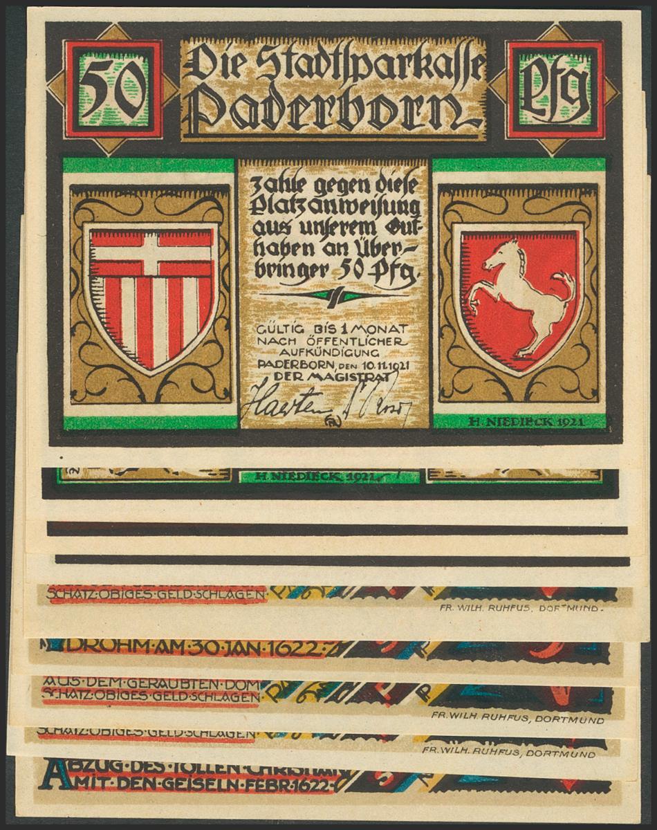 GERMANY. NOTGELD (PADERBORN). Two complete sets of 4 and 5 banknotes in the original envelope: 25 Pfennig, 50 Pfennig (2), 75 Pfennig (2), 1 Mark (2), 2 Mark (2) from 1921. (Grabowski / Mehl: 1043.2 and 1043.3). Uncirculated.