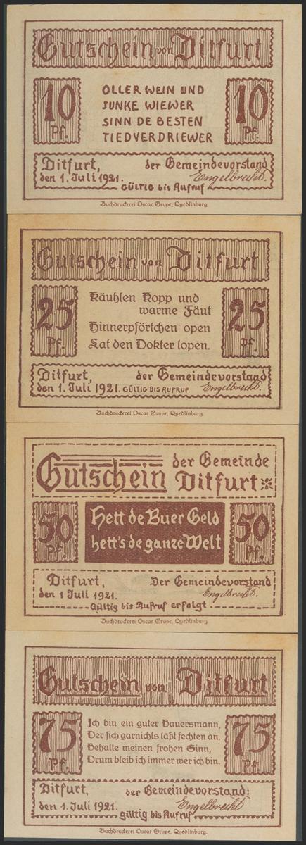 GERMANY. NOTGELD (DITFURT). Complete set of 4 banknotes: 10 Pfennig, 25 Pfennig, 50 Pfennig, 75 Pfennig from 1921. (Grabowski / Mehl: 275.1-1 to 4). About Uncirculated.